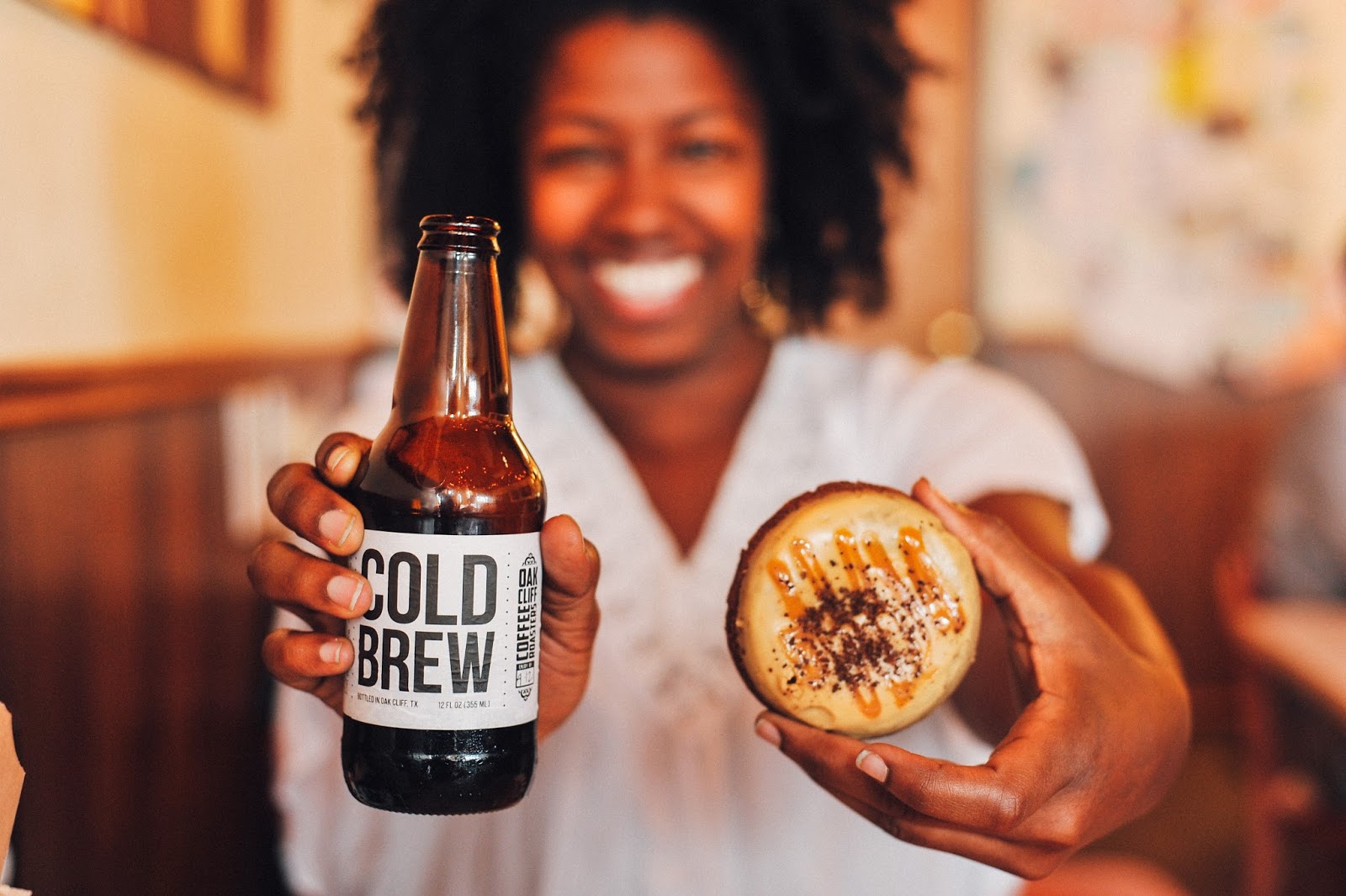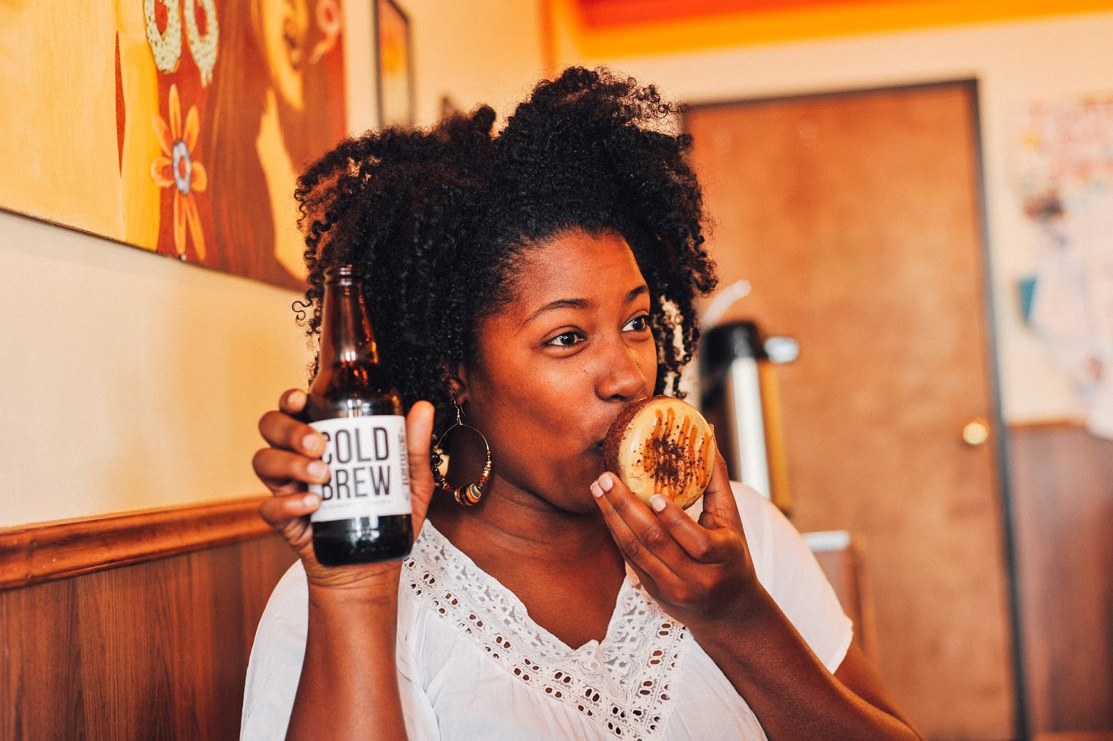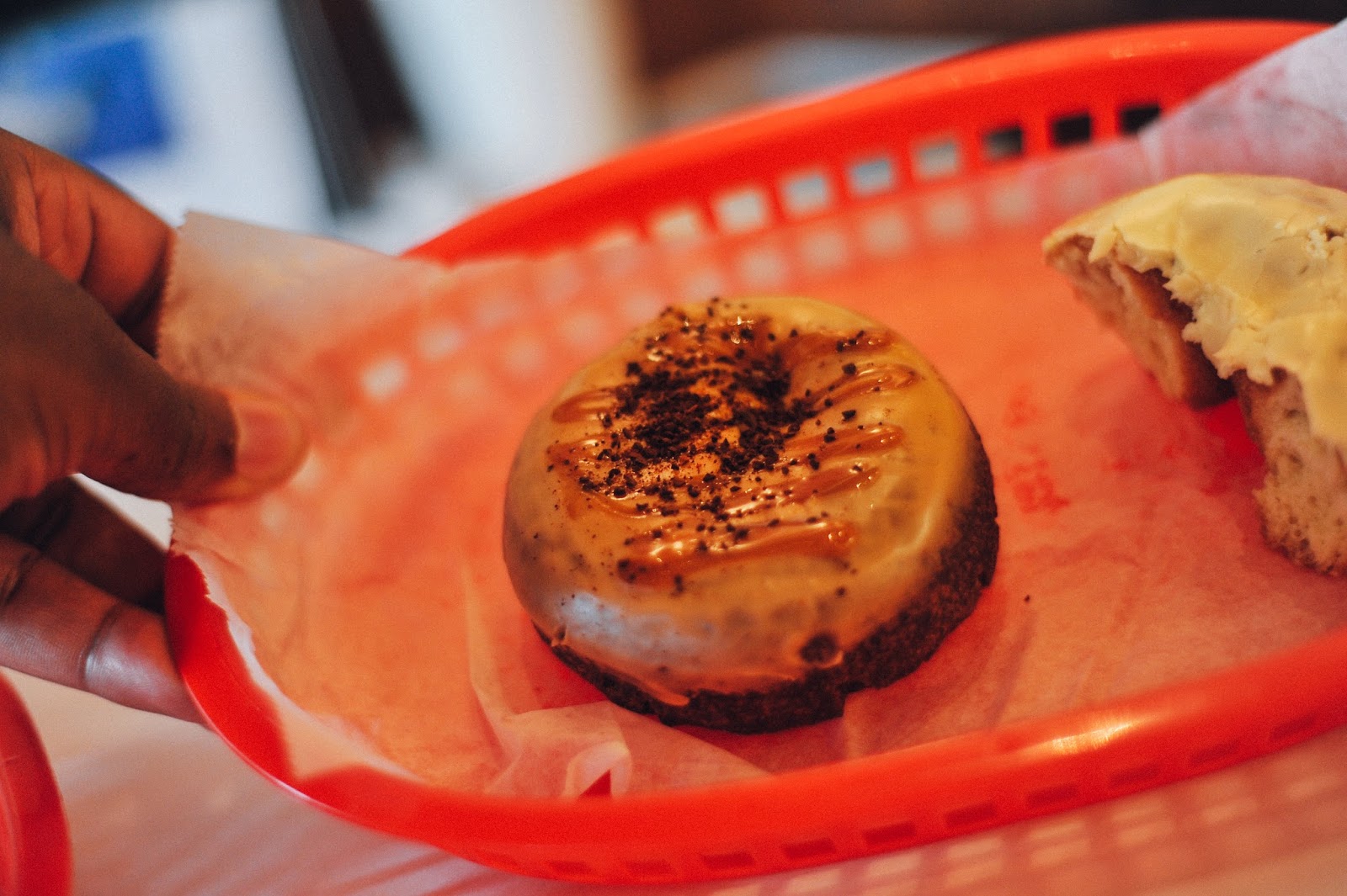 You are probably wondering who the girl with the locs is. Well,the lovely lady in plaid is one of my bestest friends and old college roomie, Kali. It’s pretty evident we still get down like we are in college; FYI-this was us being chill; downtown wasn’t ready for our turn-up. The handsome gentleman in the red would be her oh so creative husband, Darryl. They are the ultimate couple and definitely the best tour guides I’ve ever had. I didn’t spend a penny hanging out with them! Well, I bought one tasty coffee donut and the strongest cup of coffee brew known to mankind; this is not Starbucks ladies and gentlemen, I’m on that new new. They are both big foodies like me, so naturally, we stopped at a cute little donut biscuit shop called Hypnotic Donuts and Biscuits and had some good food, conversation, and of course we took some amazing food shots. I’m a big supporter of small businesses and will gladly purchase at any mom and pop coffee shop as I secretly want to own my own coffee shop one day.