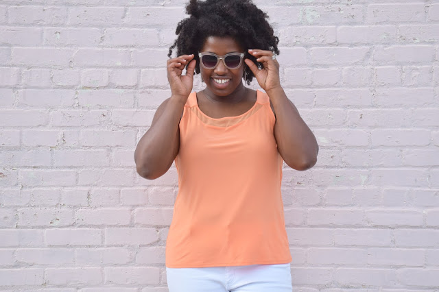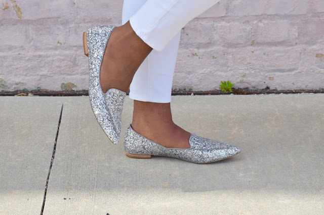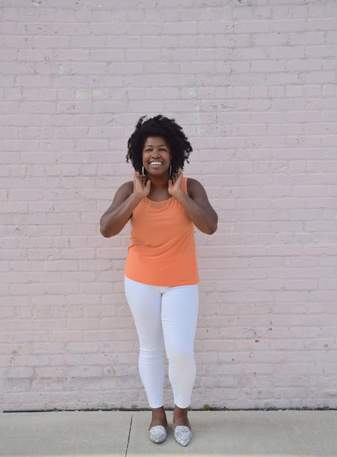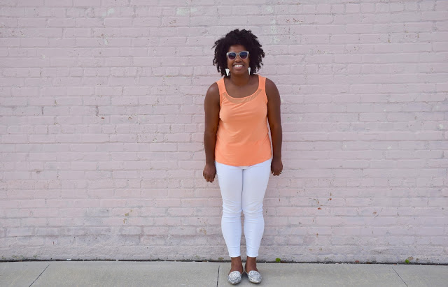 I was feeling neon orange and sparkly and decided to complete the look with some white ankle denim, pointy glitter flats, white sunnies and some geometric rose gold and white earrings; an interesting combo to say the least. White bottoms are the perfect way to balance out a look that already makes a serious fashion statement. I’m all about white bottoms year around and I’m not afraid to show it. White brightens up any look and is fresh, youthful and simple. Aside from my obsession with color, I’m also obsessed with the color white. In fact, I have a white room at my house that is not complete yet, saving some money up to purchase some white furniture pieces. Sounds a bit overboard but its gorgeous,trust me. If your not convinced, Google “all white rooms” and you’ll change your mind. 🙂 If your looking to simplify your look? Keep it easy breezy with some white bottoms and a solid-colored or patterned top. I usually follow this rule when I’m in a rush and need something on hand. If you haven’t already done so, purchase some white denim for the summer! It’s definitely a must have for any fashion-lover.