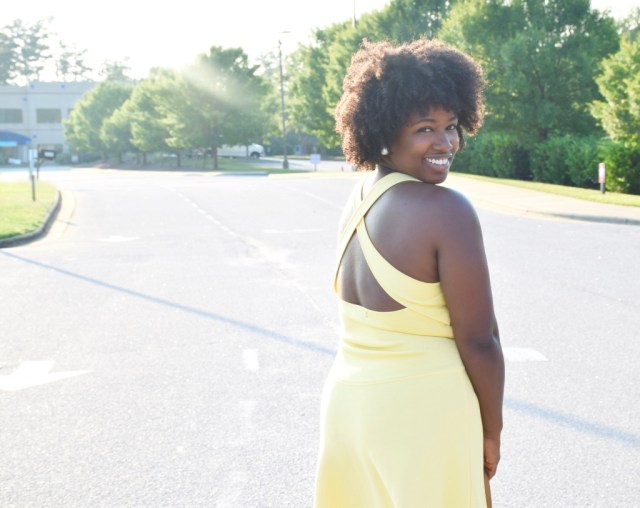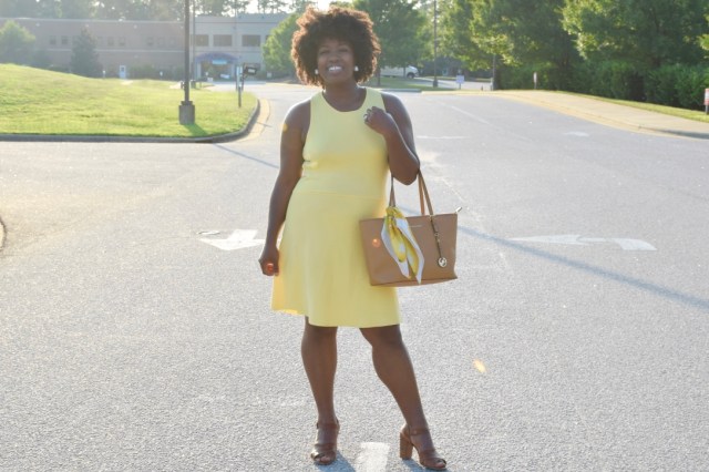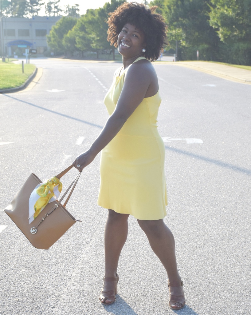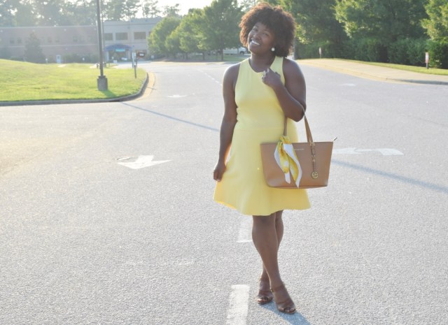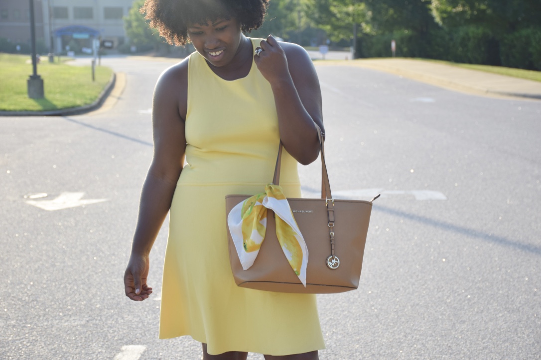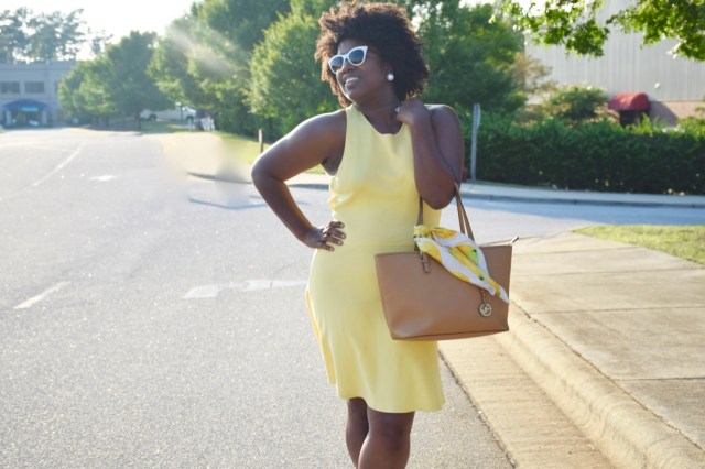 I saw you checking out my lemon scarf ;). I purchased it from Talbots I say about 4 years ago. This has been the most delightful scarf to own. Never thought I’d purchase anything with food on it but this scarf was not over the top or in anyway obnoxious. I’ve worn it a few different ways but this is the first time I’ve worn it to decorate up my plain jane purse. But about this dress, I imagine myself taking a romantic picnic with the hubby in this dress but then I also imagine my skin melting off from all this NC heat! It’s just to darn hot to be picnicking, biking, runs, walking, heck breathing in this heat, LOL. All those in favor of spending the rest of summer posted near the AC with some Netflix and Hulu say “I”….yup that’s what I thought! 🙂