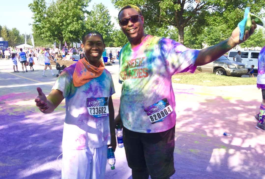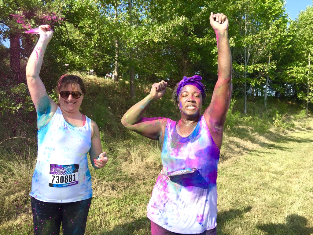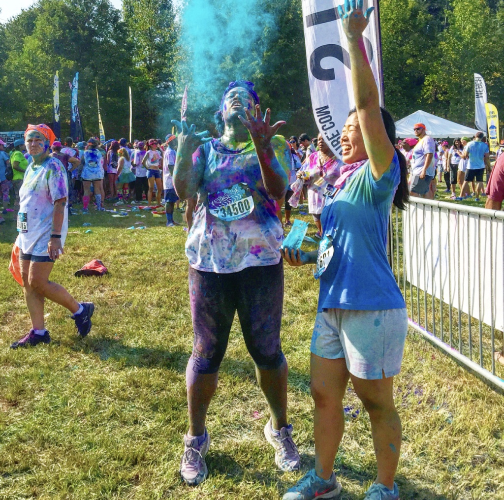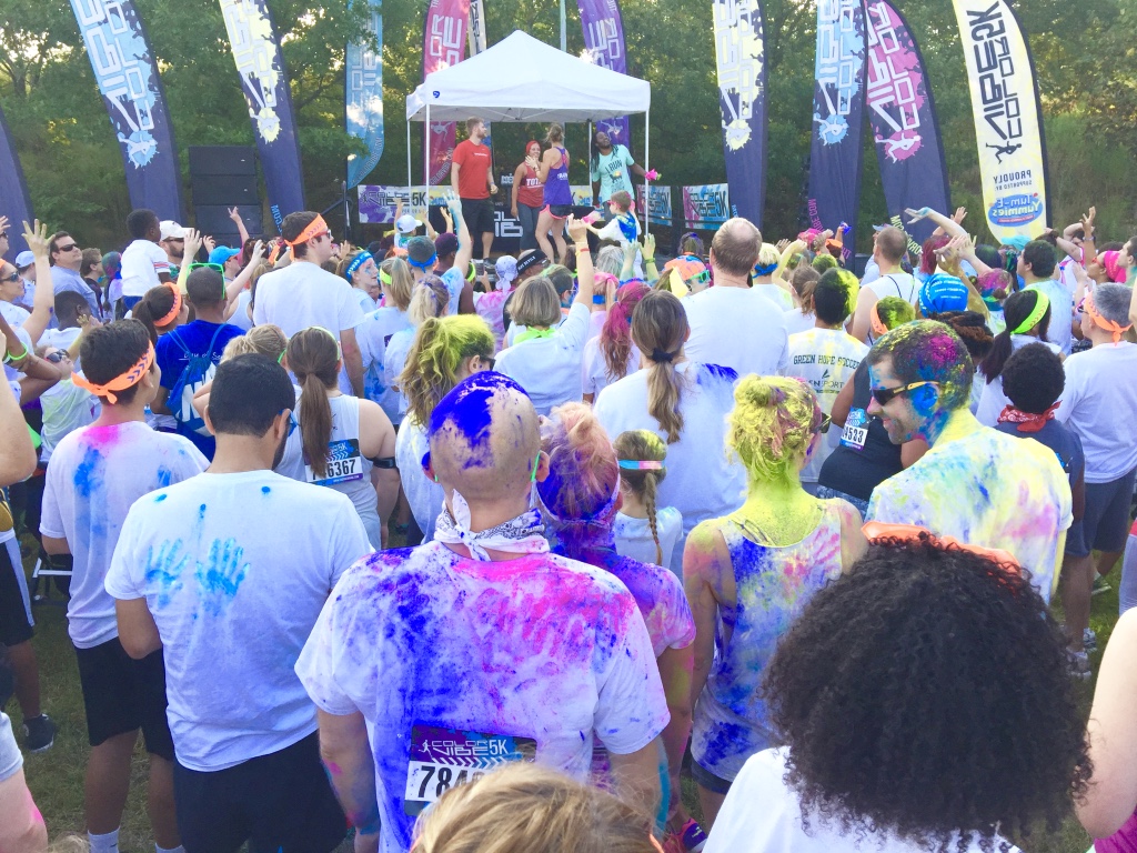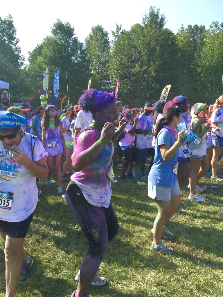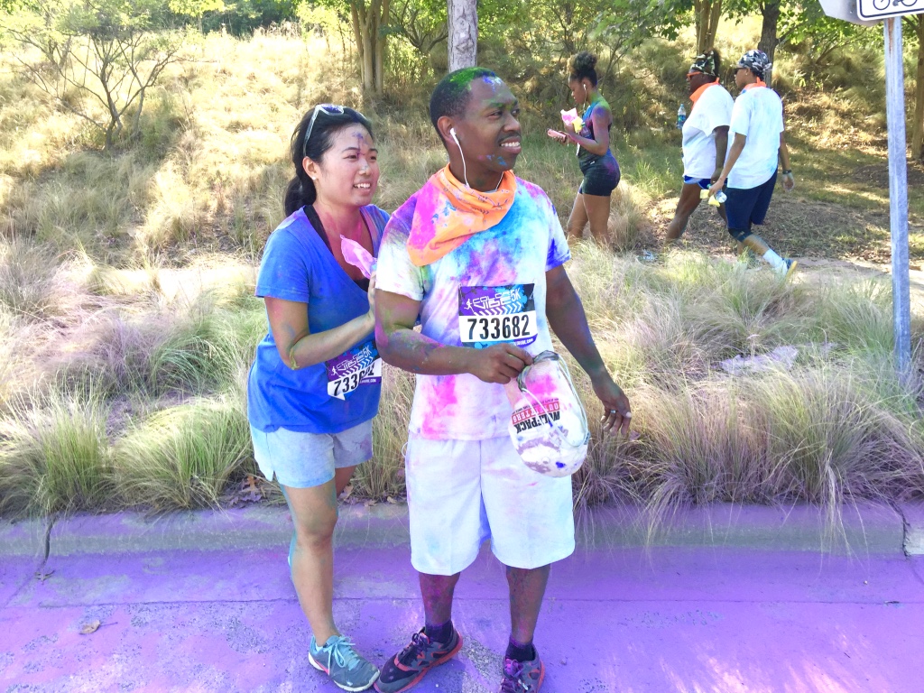 Guess who completed their first 5k? Deidra Craig did, and I’m proud of it! I spent the weekend getting color dust tossed at me in the blazing hot sun while attempting to complete 3 miles. Might I add that it was all worth it. I was accompanied by none other than the color squad of the century, my girl Hannah, a few co-workers and of course, Charlie Boo. I spent months training for this darn race and ended being so distracted by that magic color dust that I’m not even sure what my run time was. Of course, to get my moneys worth, I made sure every inch of my body was covered in color-head to toe. Surprisingly enough, the color washed right out of my hair-definitely one of my major concerns that day. I will say this though, the color dried my curls out! I had to deep condition for over an hour to regain moisture balance and detangling was a beast, so if you decide to do one of these runs, I suggest covering up your hair with a shower cap or scarf. I’d rather look funny than have to go through the deep conditioning and detangling session I went through. I guesstimate it took about 3 hours to do my hair because of that darn color. Note to self:magical colored fairy dust doesn’t make your hair grow. 🙂