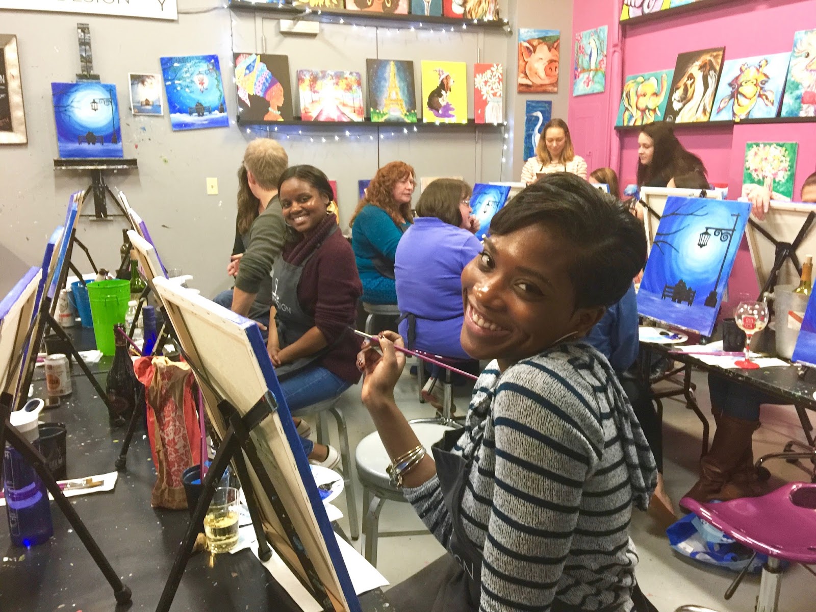 Spent my Friday night sipping away on some good ol Italian Wine while painting lovers on a bench full of snowflakes and leaves. Definitely not a bad way to begin my weekend. Last time I did wine and design I didn’t bring any wine to sip on. Weird, huh? I learned my lesson and grabbed a bottle of red for this rodeo and apparently my friends were thinking the same thing and brought bottles of their own, I guess this explains why I painted snow on a tree full of colored leaves. Wine somehow has that effect on you. You begin to imagine things that would never actually happen, LOL. I had the best teacher that night and this class was the absolute best. She encouraged creativity and pushed us to step out of our comfort zone, the ideal environment for the dreamer and lighthearted. I highly suggest a trip to a wine and design near you. It’s just a great place to let out some stress, and just relax and get your fingers totally covered in paint while mistakenly sipping your paint water instead of your wine, it happens. If your curious, my friends and I visited the Cary location. Such a great group of people, full of energy and good vibes. What more could I ask for?