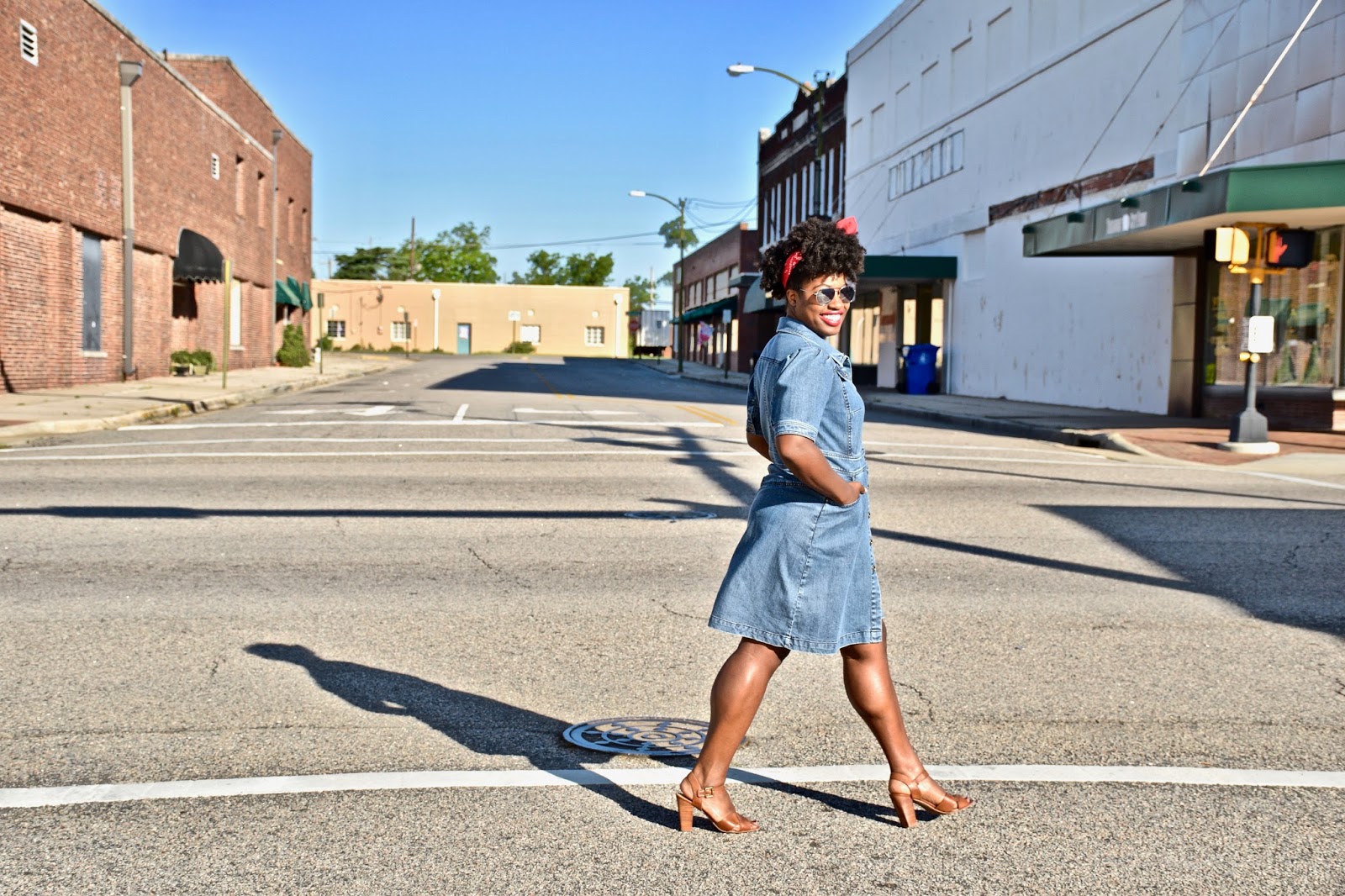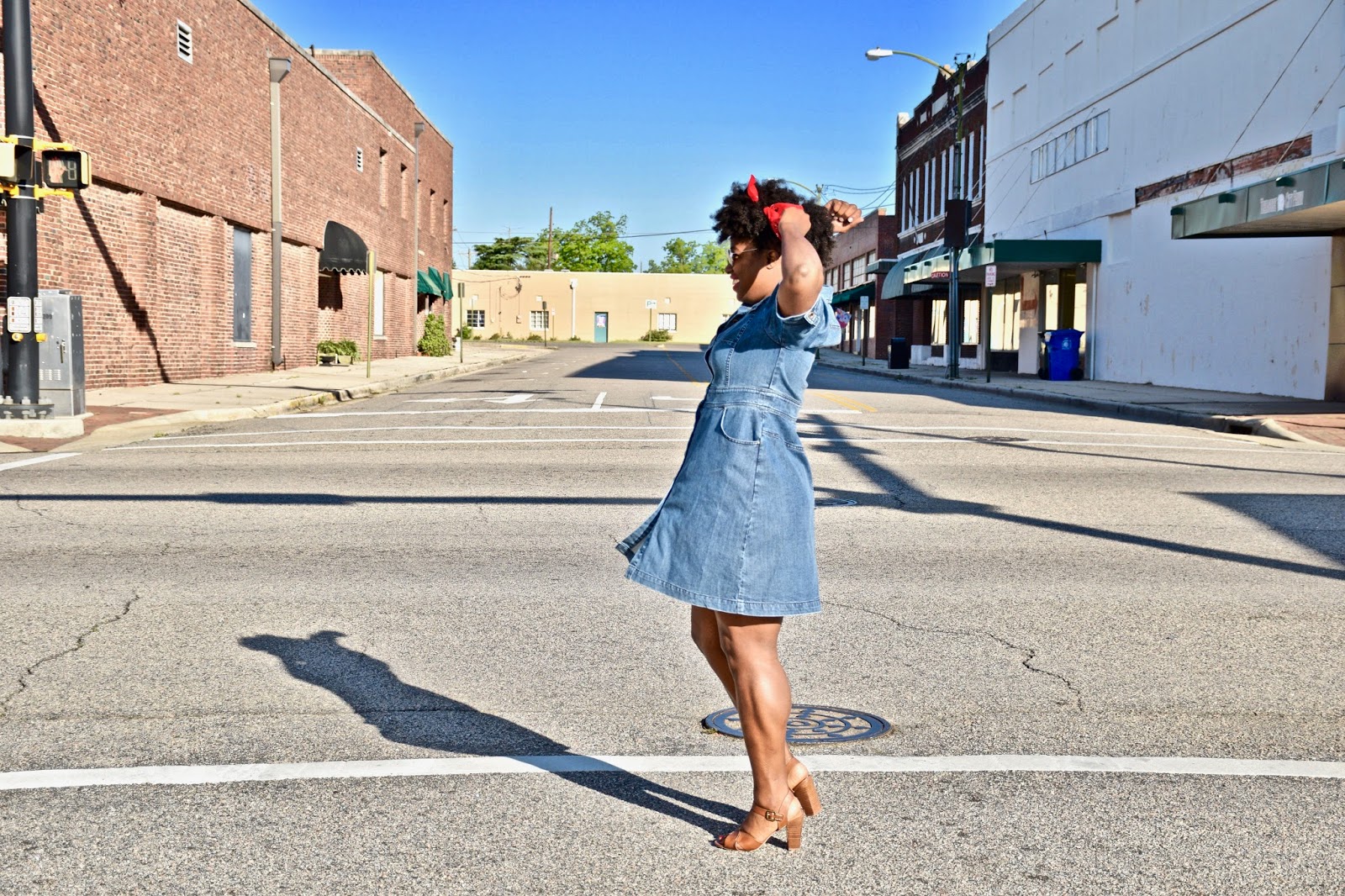 I put together one of the cutest Memorial Day looks for this weekend and I’m super excited to have teamed up with eShakti for their #RealFashionForRealPeople campaign to do it! Denim has always been a fav of mine, and I’m no stranger to a simple denim dress with quirky details. The best part about denim is that you can practically pair it with anything. I have denim tops, denim pants, denim skirts, but there is nothing like a simple denim dress to slip on when your on the go. For this look, I kept it real simple, and paired it with my cognac heels, red lippy and a red bandana to give it sort of a vintage vibe. Some other ideas to really elevate the look, and style the dress would be to add a scarf or layer it with a jacket, perhaps a lighter wash denim jacket. Denim on denim is a big trend right now. I’ve worn this dress 3 or 4 times already and have dressed it down with some all white low top Chuck Taylor’s, and have dressed it up with bright colored blazers and fun, edgy shoes. The shoulders of the dress have a 80’s vintage feel that I just love, so styling this dress with big hair and fun bright colors is a must!