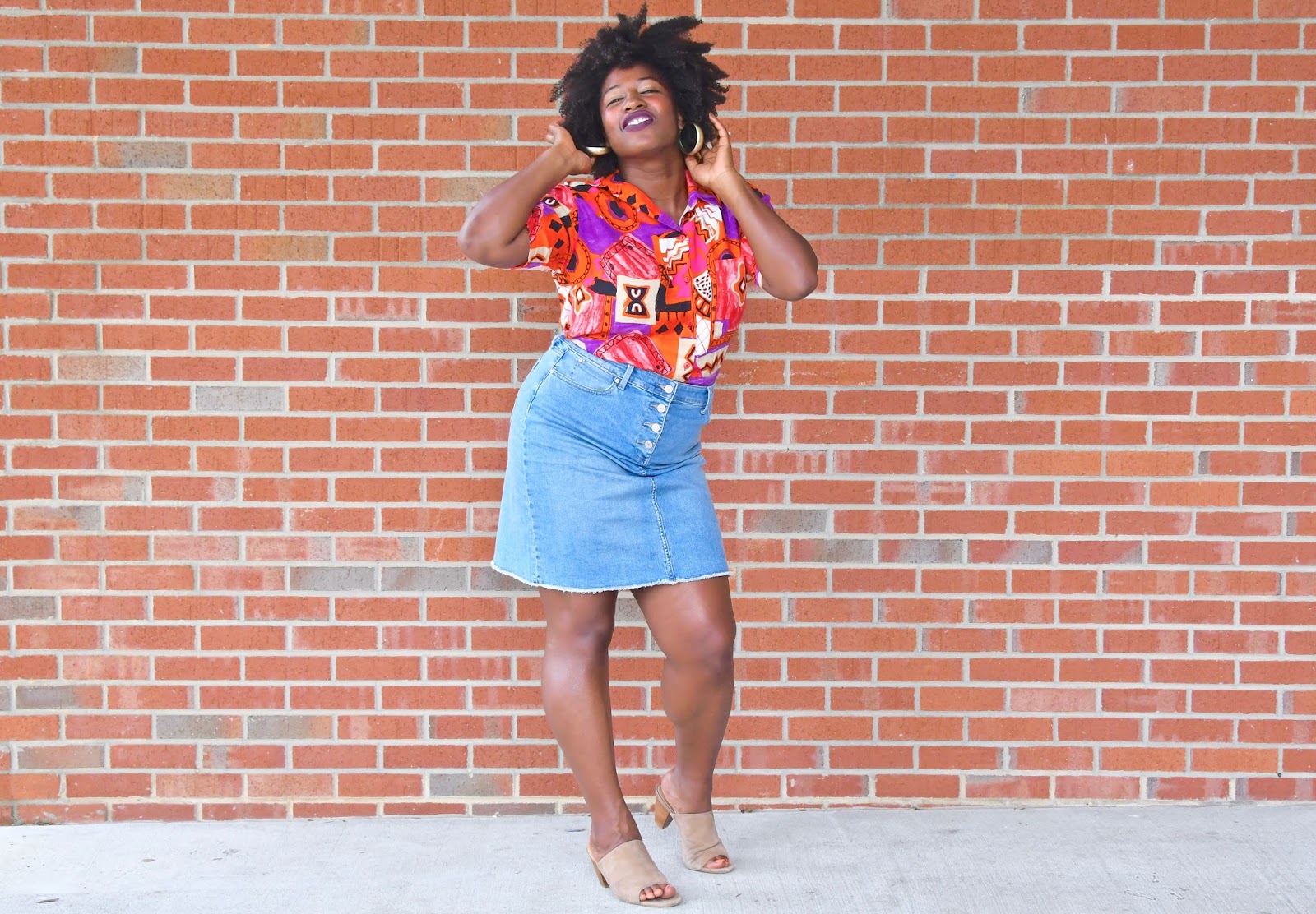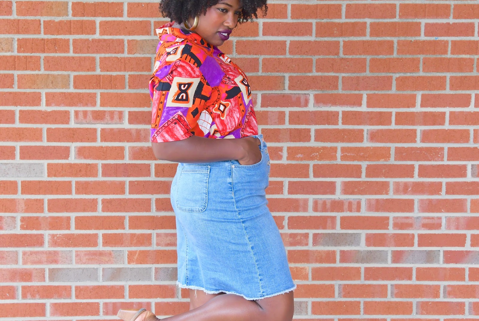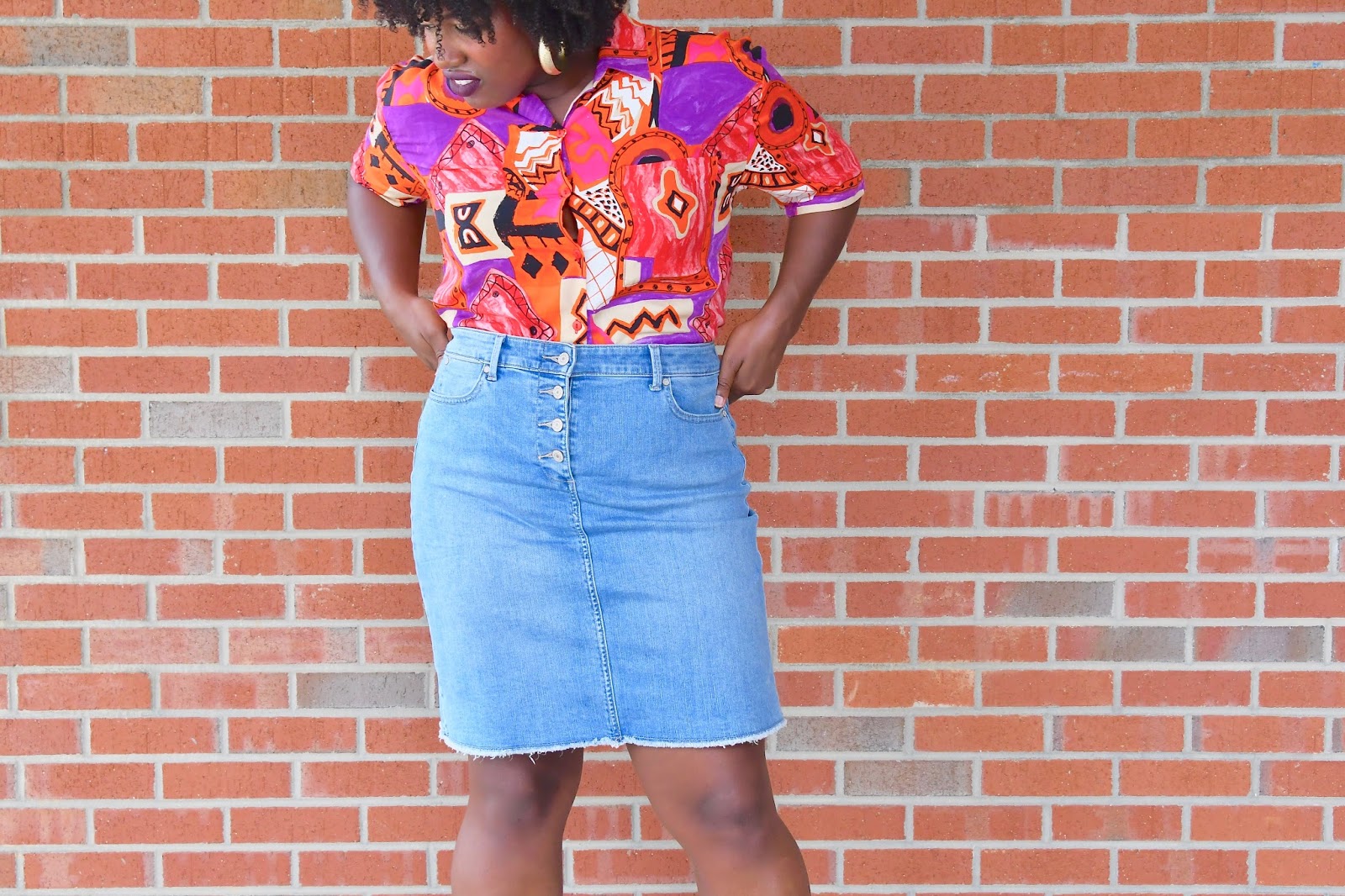 Taking it back, Living Single style with my 90’s button up from Father and Son and denim skirt from Talbots. If you don’t already know, I’ve been on this vintage kick ever since I attempted to give my clothes away for money to a couple of consignment shops and they told me my clothes were old and not worth much. After that nonsense, I decided I would no longer spend tons and tons of dollars shopping for items at the mall and online that would only be worth a few bucks a couple of years down the road. Don’t get me wrong, I occasionally get an updated piece here and there if it’s extremely discounted and available in my size but for the most part, I’m shopping vintage now.