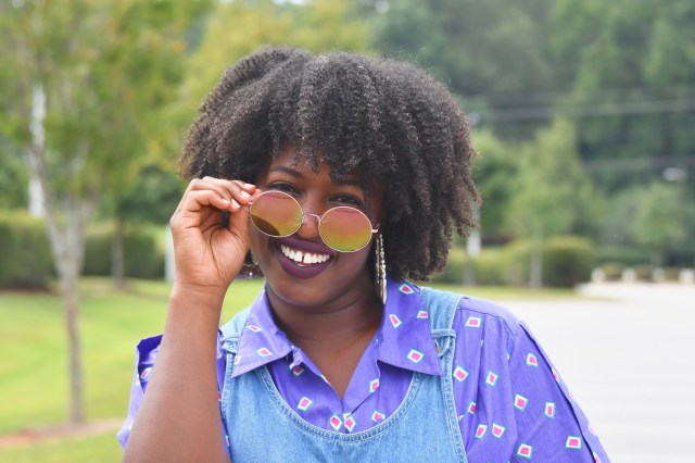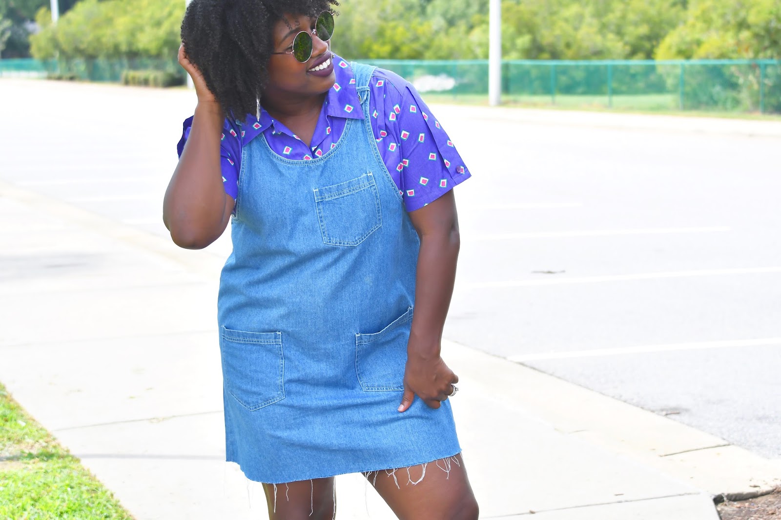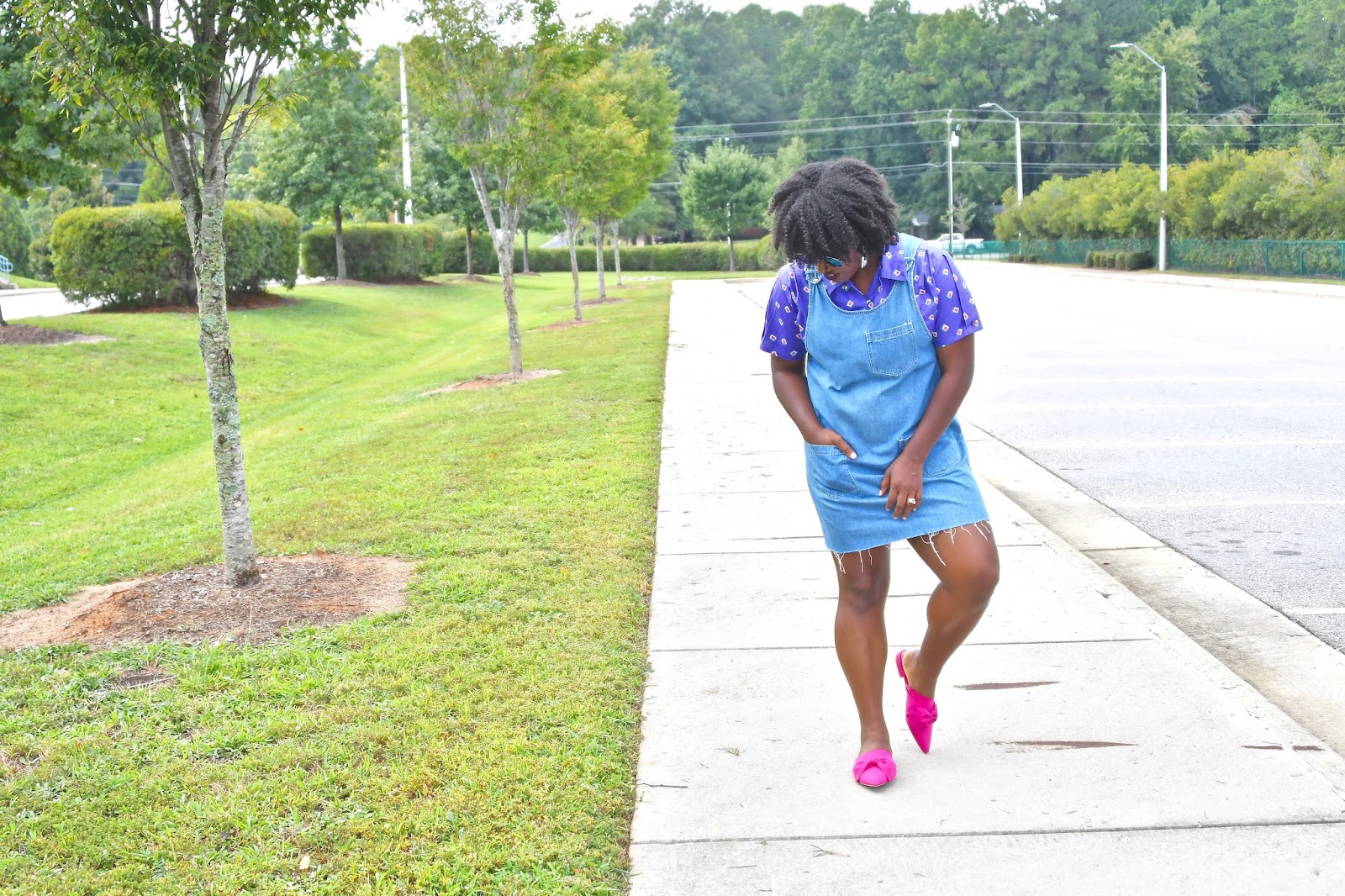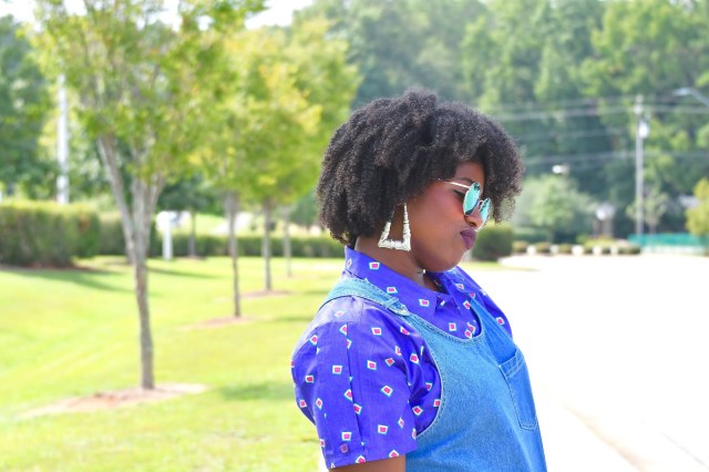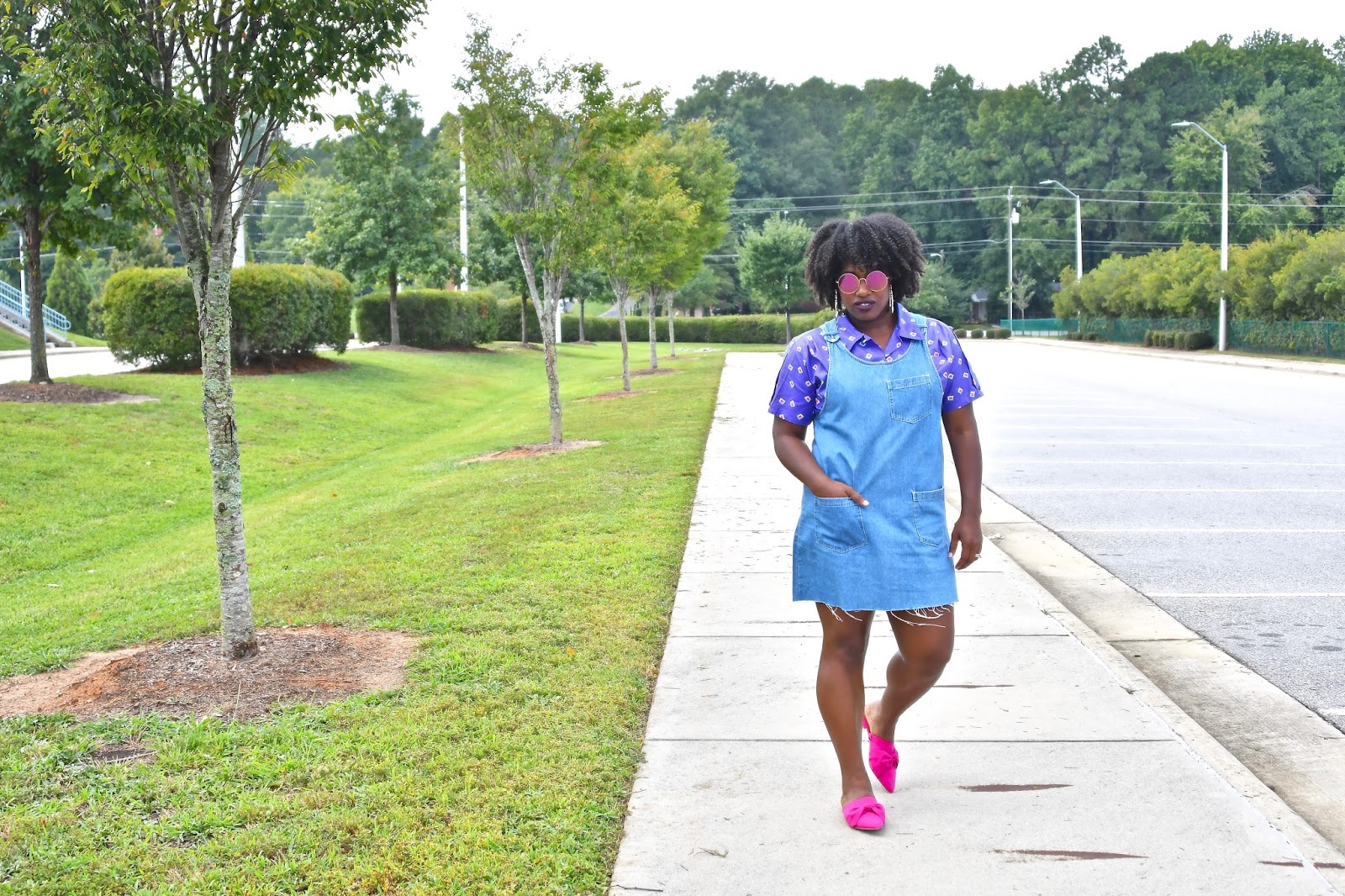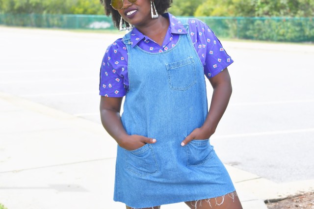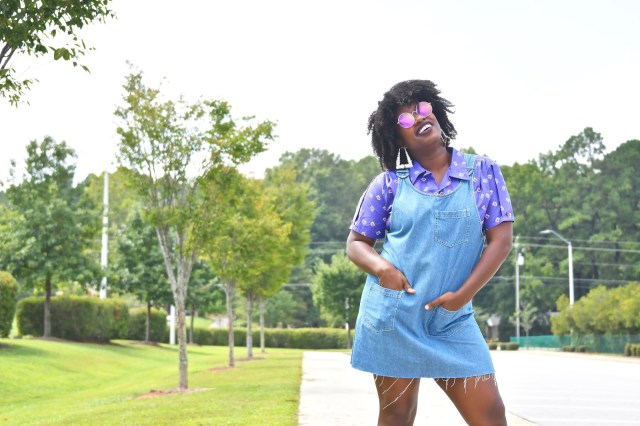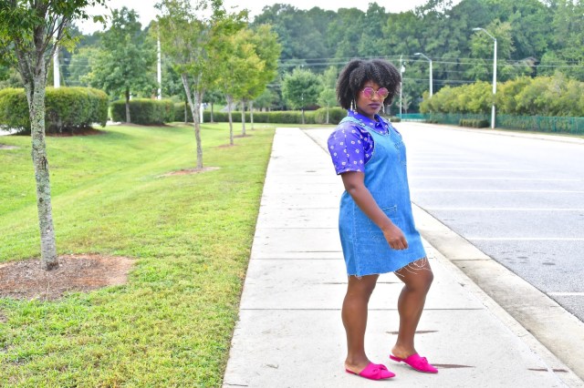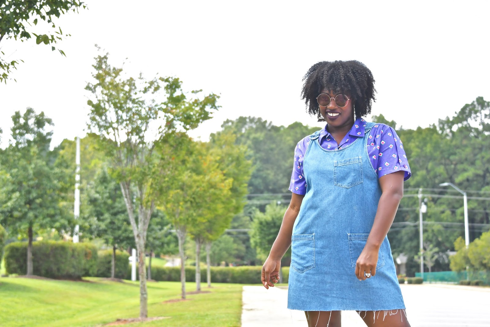 I made it all myself. Nah, just kidding, nabbed this amazing purple print button up from one of my new fav online vintage funk shops, The CruLook (link above). Also, my cute denim jumper is thrifted as well. I’m not sure of the shop but found this jumper during my ladies trip to VA a few weeks back. It’s still very warm here in NC so a denim jumper like this with a funky and fun top underneath is a must. I’m right at that awkward time where I’m not sure if I should take out my fall and winter bins or keep them where they are. Summer to fall transitions are so hard here in NC because the weather is so unpredictable. Speaking of transitions. Short sleeves won’t always work for this jumper once it starts to get colder here in NC so if your looking for ideas on how to style a jumper with the changing weather, try a long sleeve shirt and if it’s really cold you can wear a cute turtle neck. I love wearing my jumpers with booties and sometimes if I’m feeling real 1990’s vintage circa “Clueless” days I’ll do a beret and some knee high socks with Mary Jane shoes, it’s such a cute way to express yourself, look retro but still fashion forward and fun. By the way, I’m still wearing white until I feel it’s no longer appropriate, and no date will determine that for me. Fashion is about breaking the rules. I break them daily, and I’m okay with not looking like everyone else. Don’t be afraid to standout, mix and match your looks and try something you’ve never tried before. I encourage everyone to wear white for as long as you choose! Just look hella cute doing it ;).