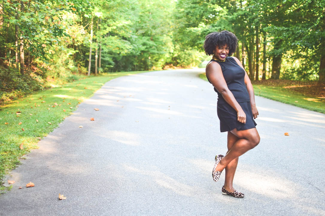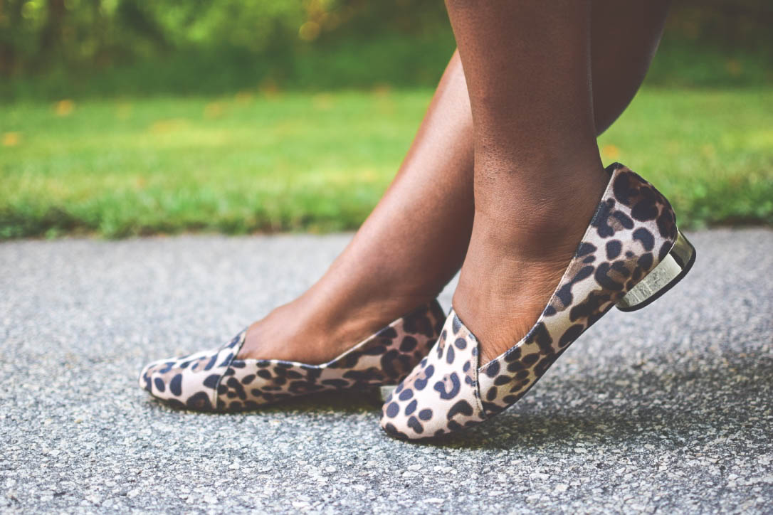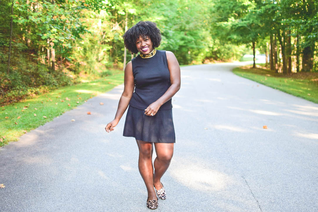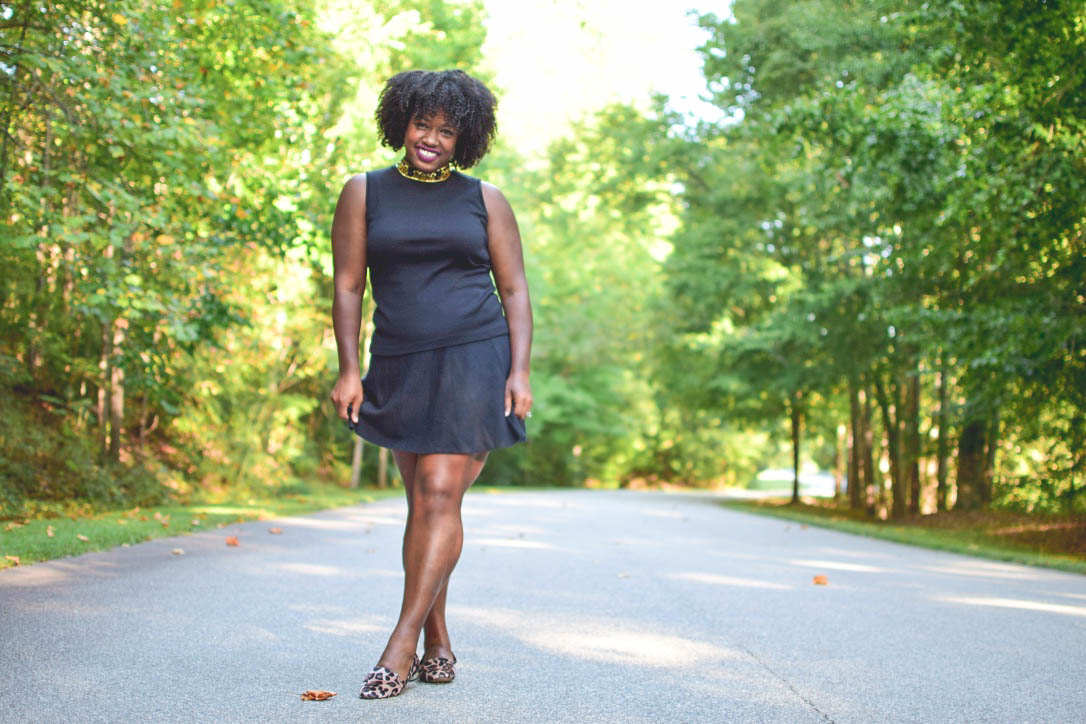 All black is great but nobody wants to look like they just left a funeral everyday, so dress it up with a bright fun purse or in my case, an embroidered mock neck sweater and leopard print flats.
