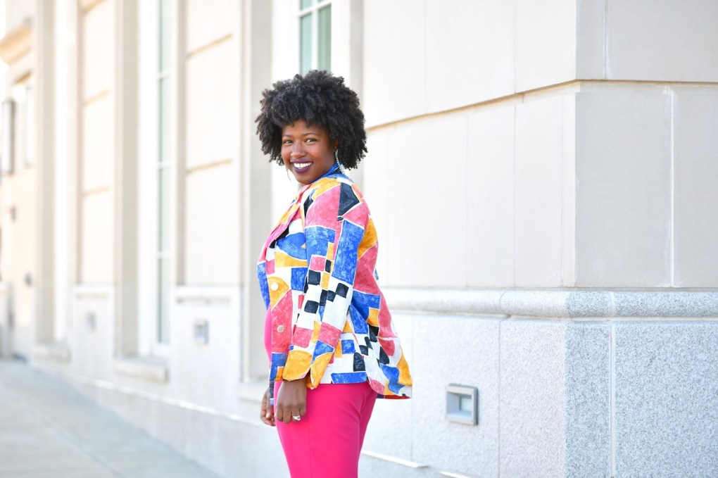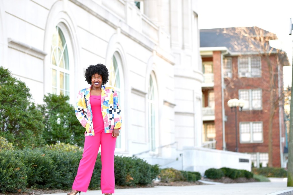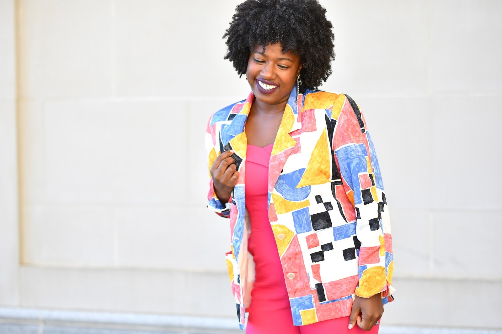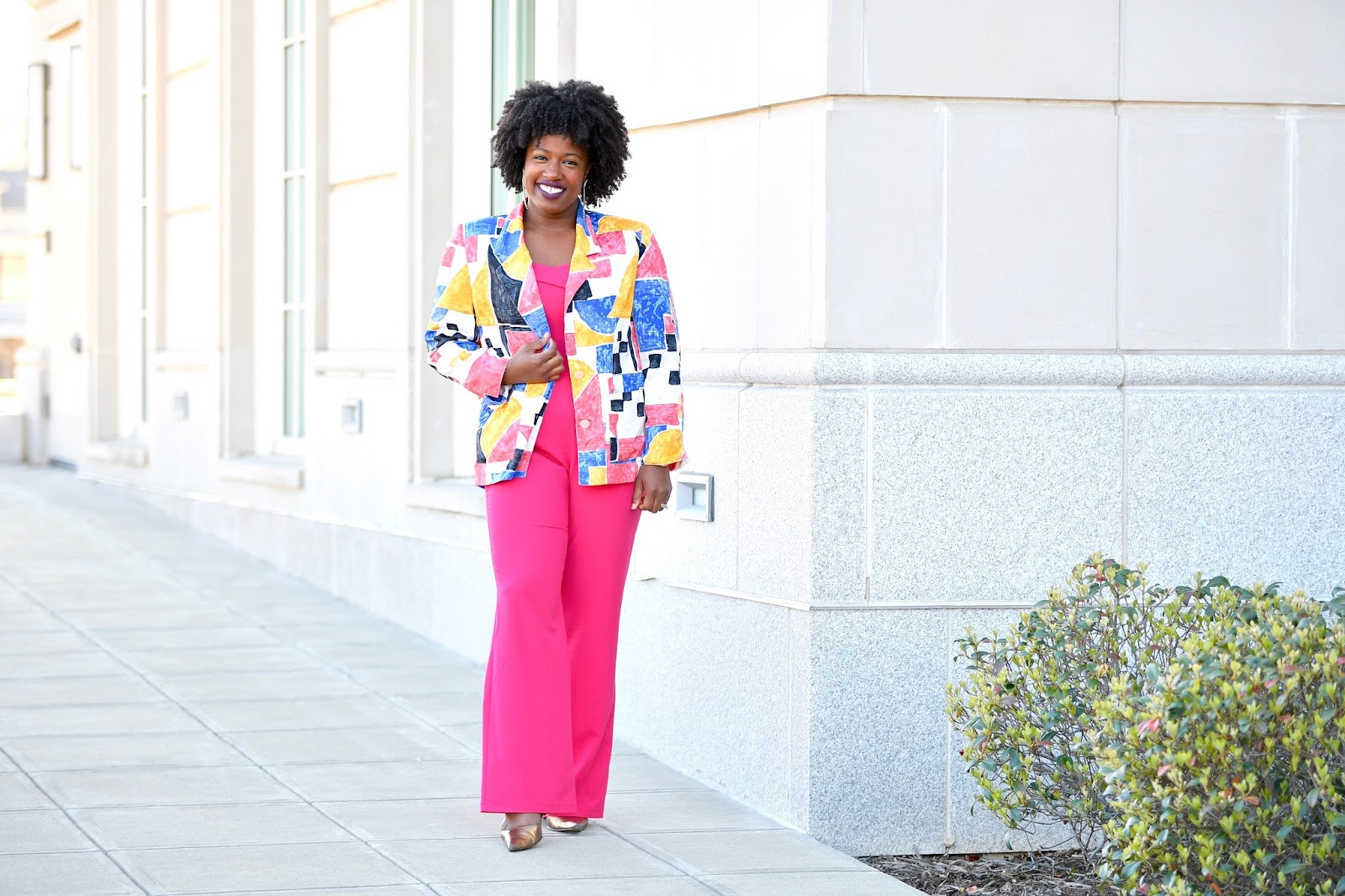 So, about this outfit. The pink jumpsuit was purchased sometime last year from the new Gabrielle Union clothing line at New York and Company. I am such a sucker for a jumpsuit and even more of a sucker for a jumpsuit in a neon bright color. If this is your first time reading the CCC blog, then you couldn’t possibly know that I’m completely obsessed with bright colors, prints and anything vintage or thrift. I work hard to bring color to my content and hope that it brings happiness to your day. My blazer was purchased from a vintage shop called vtijkandi.com I found them while scrolling through post on Instagram. I’ve purchased several items from this shop and they never go wrong. All items are reasonably priced and they have $5 deals! Can’t beat that, huh? If you’re ever in the mood to buy a funky printed blazer or top, check them out at the website link above or check them out on Instagram at @vintijkandi.