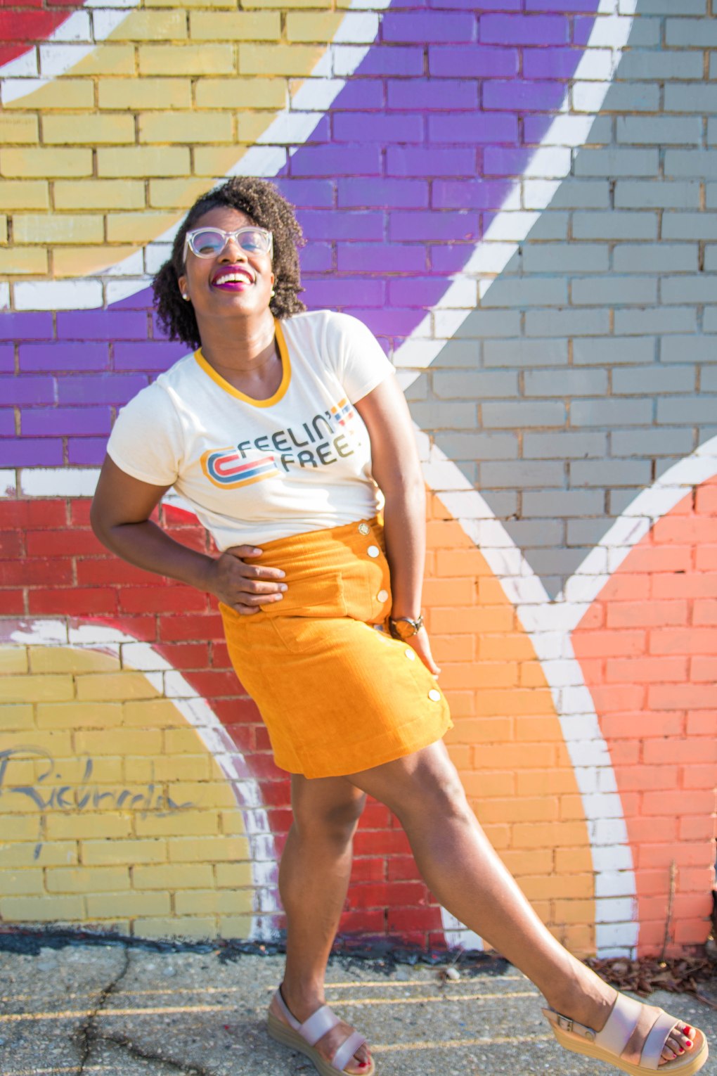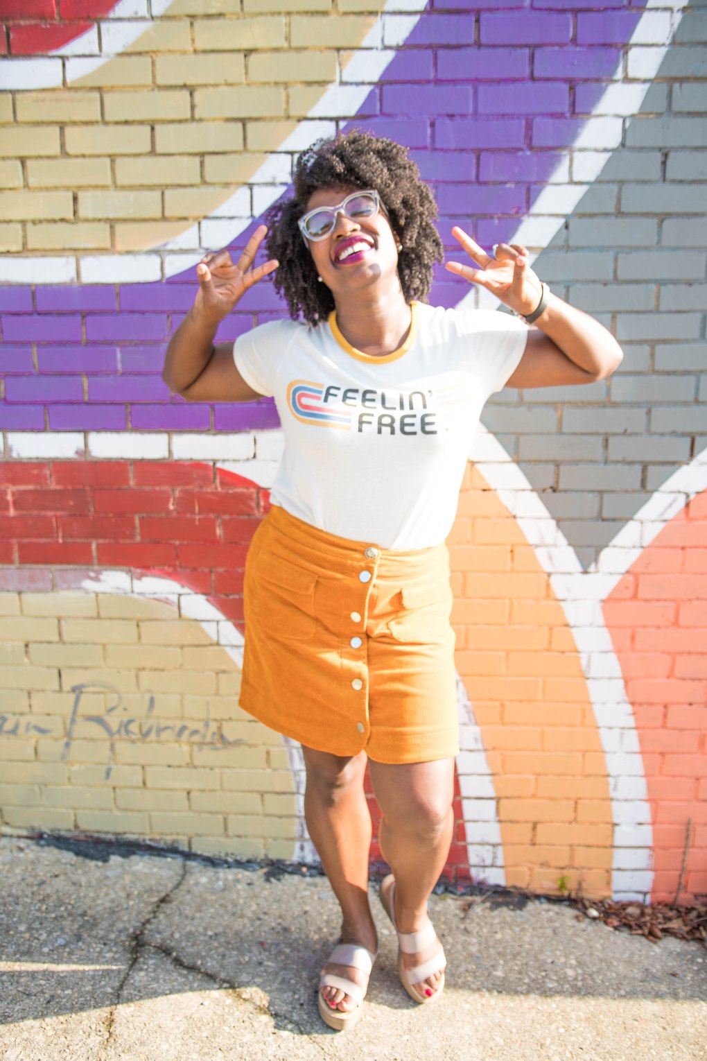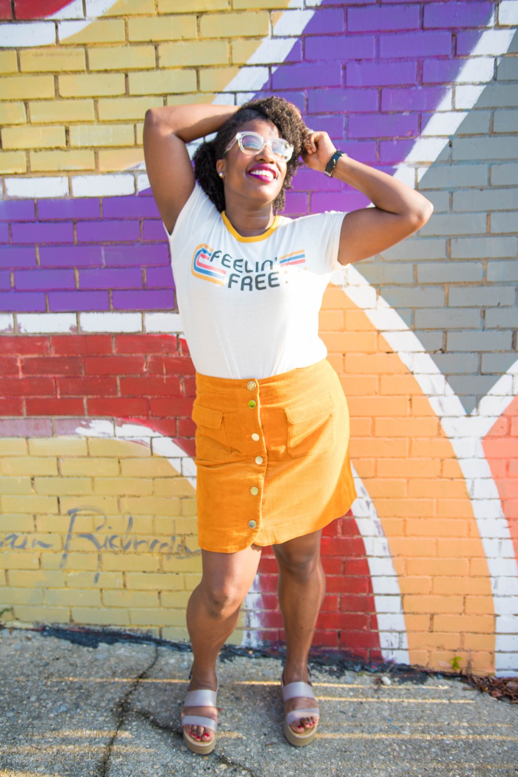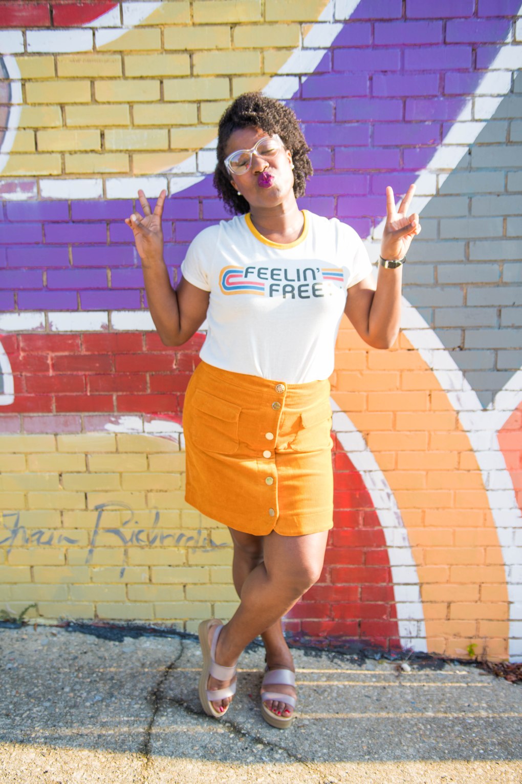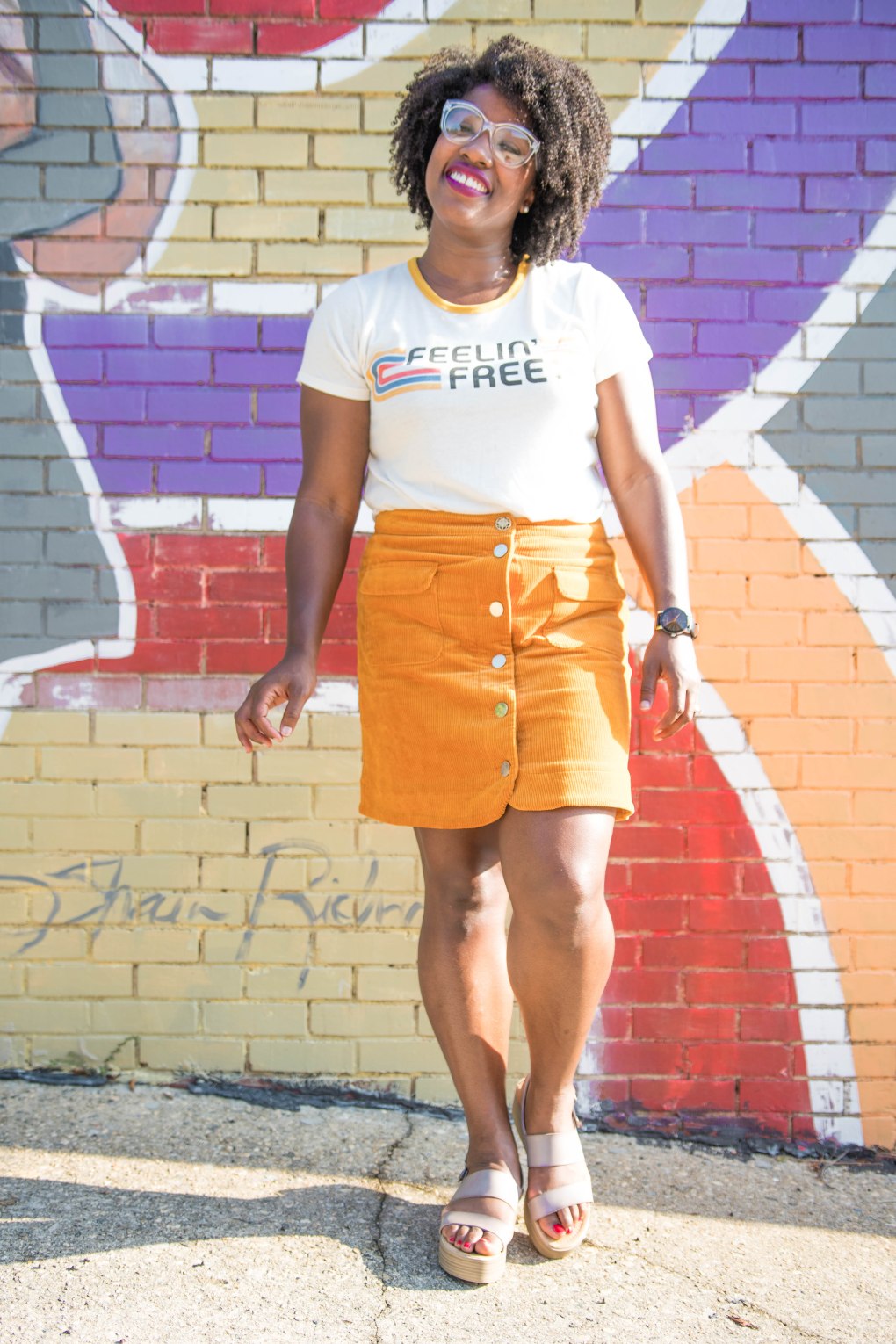 Well, it’s officially Fall ya’ll, but in North Carolina that means absolutely nothing, LOL. Us North Carolinians don’t begin to see hints of Fall until right around mid October, sometimes even late October. We have second summer here so I don’t get too excited until it’s time to start wearing a light jackets. I literally feel all weird inside trotting down the street in shorts and tank sipping on a pumpkin spice latte. There is something wrong with that whole situation, LOL. Until it cools down I’ll be rocking transition outfits like this cord mustard yellow skirt with summer tee and platform sandals.