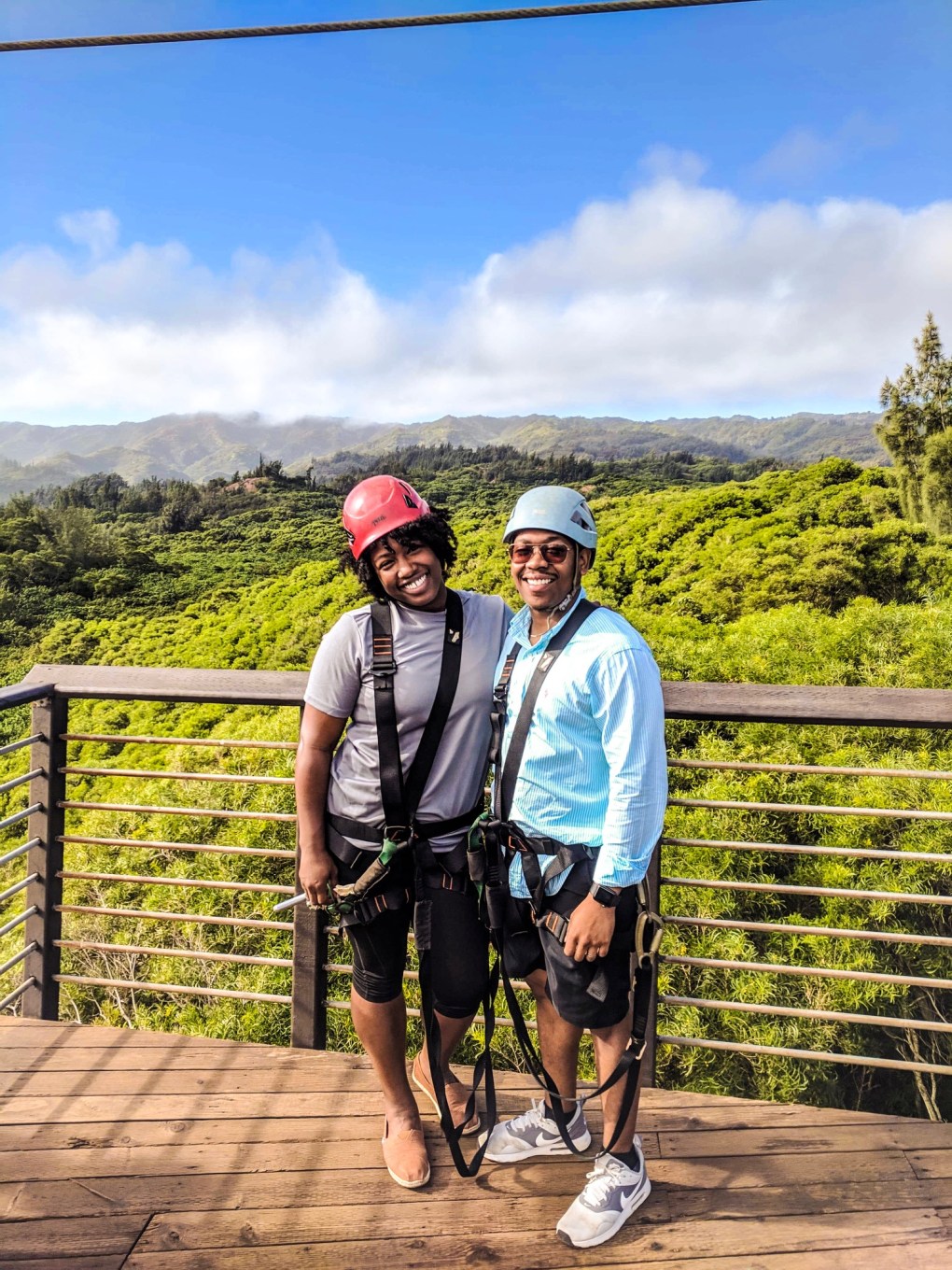 After the conference, we only had 2 1/2 days to explore the North Shore of Oahu. Charles and I literally jam-packed as many activities as we could into these 2 days. Talk about exhausting. From sun up to sun down we organized activities to really get a full look at the island as much as we could. First stop was a visit to CLIMB Works to do a bit of ziplining. It was by far my favorite zipline experience to date, although zip lining over gators in Saint Augustine, Florida comes in at a strong second place. We met the sweetest newlywed couple who snapped a few shots of Charles and I doing what we do best, acting cray cray, LOL. We also met another couple who also snapped some super cool pics of us. They were zip lining to celebrate his 47th birthday. Allow me to add that this dude didn’t look a day over 35, just saying. Later in the day, we grabbed some grub at this amazing local Hawaiian spot. I had a grilled pineapple vegetable sandwich and some tasty fries. We then headed back to Makena beach again because clearly we can’t get enough of this darn place. The next day, we headed to Kualoa Ranch Private Nature Reserve and did a full day of touring there. For those who don’t know, Kualoa Ranch is famous for their beautiful landscape which is often used as the backdrop for many famous movies and television shows such as, Jurassic Park, Jumanji, Snatched, Lost, Hawaii 5.0 and 50 First Dates, just to name a few.