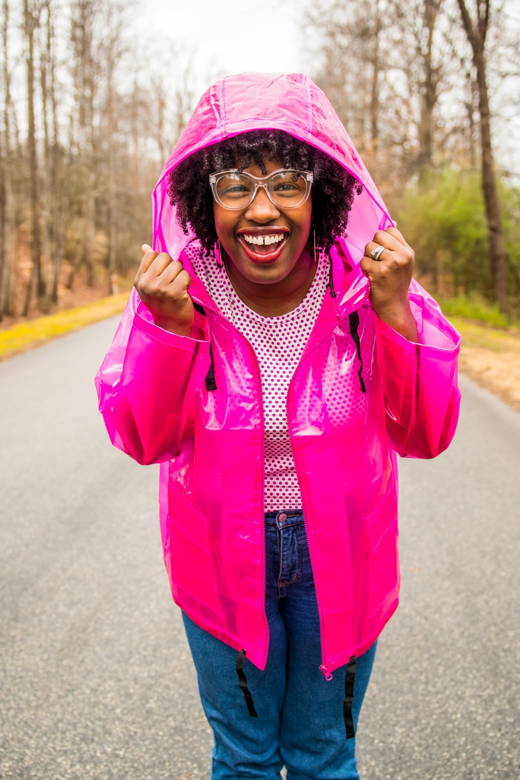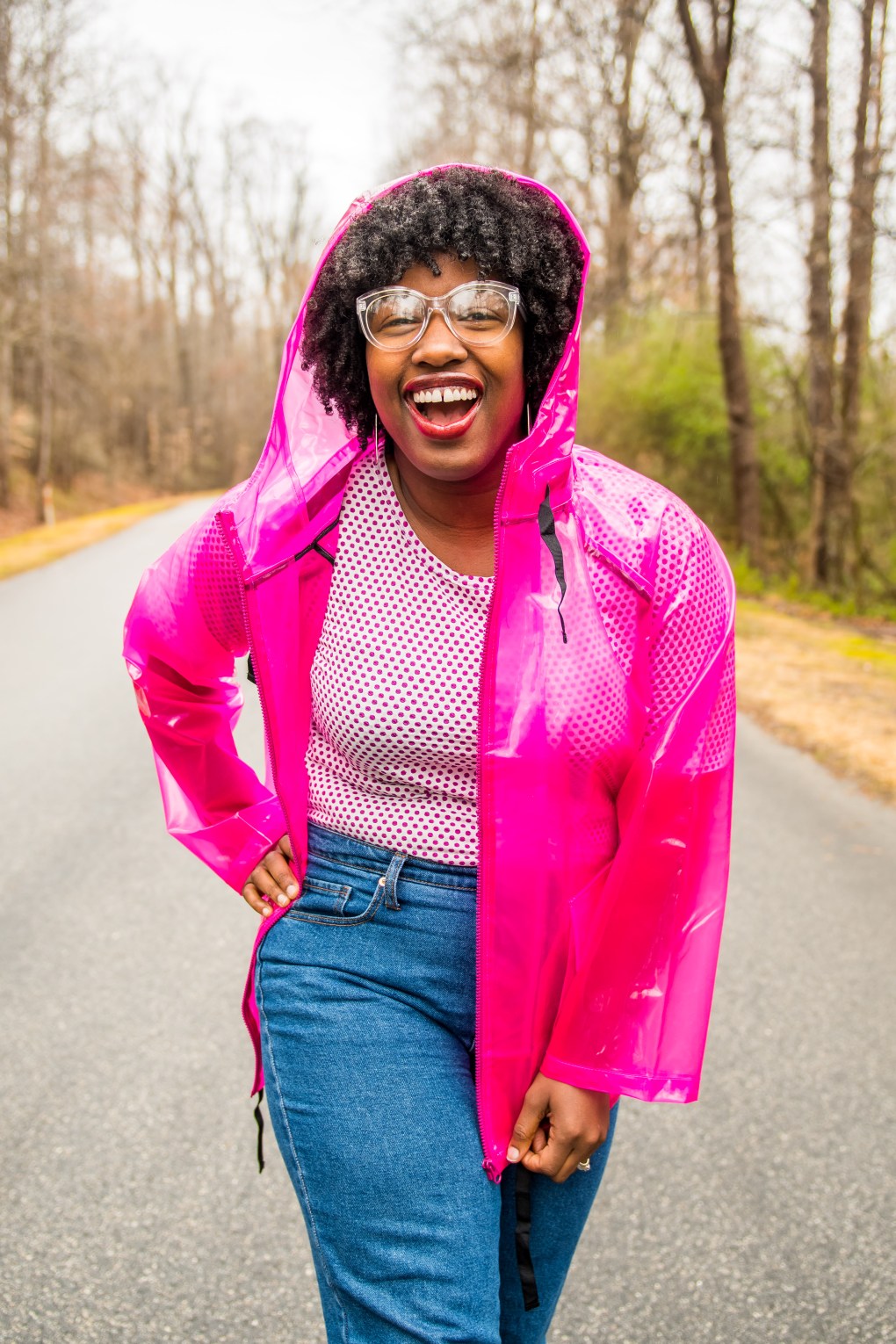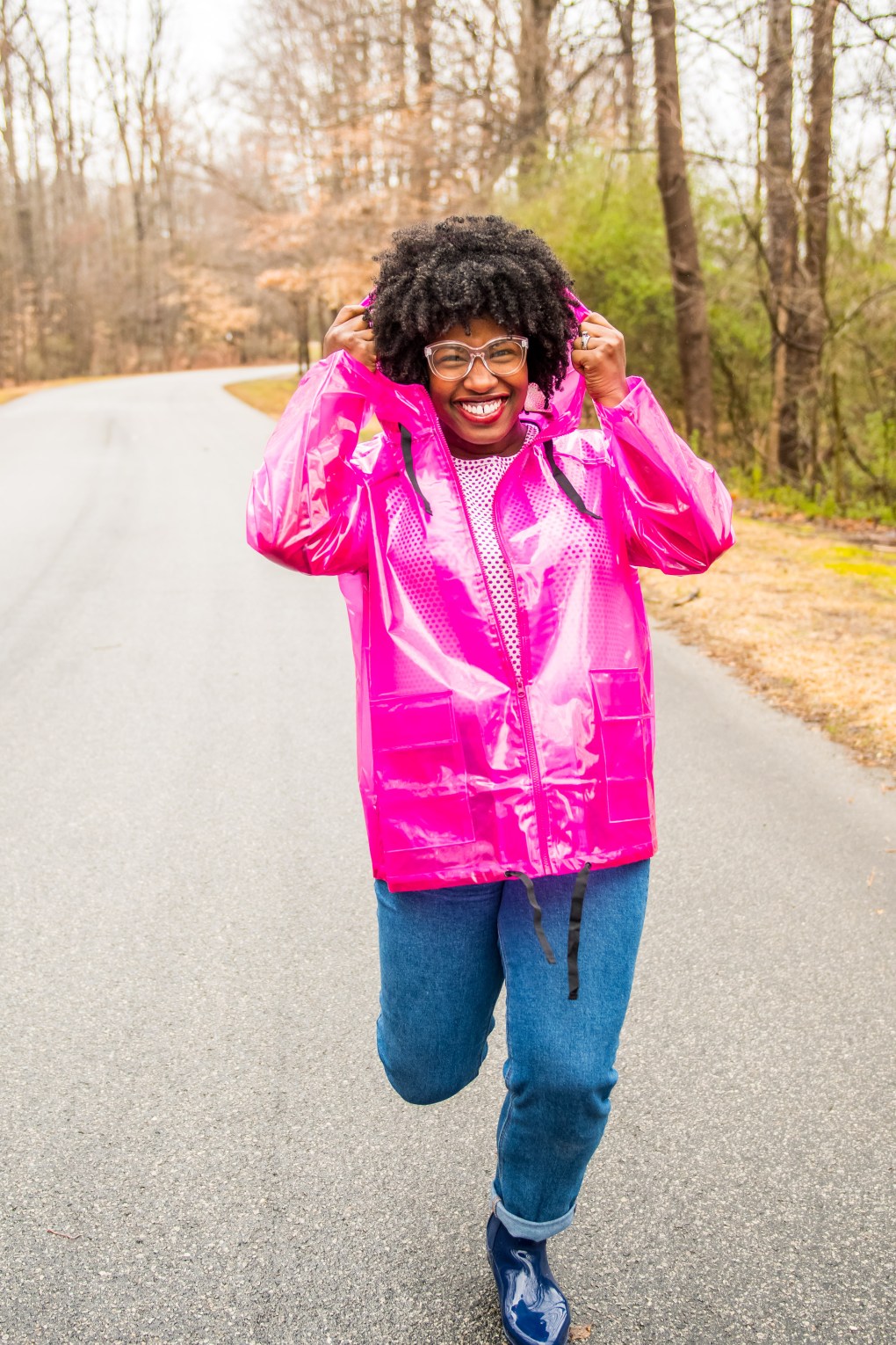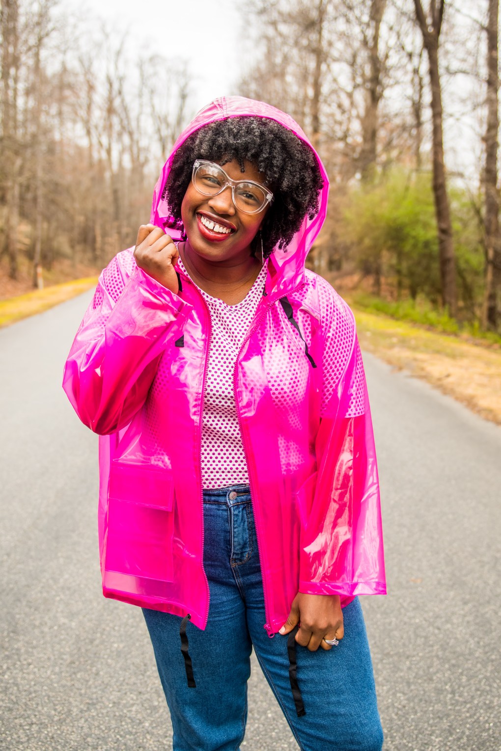 This fun pink transparent rain coat is from ASOS. Link to this super cute coat is above along with my mom jeans and rain boots. The pink polka top is thrifted from Plato’s closet. If you don’t know by now, I rock a thrifted piece with just about every look I put together. It’s my way of supported the sustainable fashion initiative and reducing the amount of clutter going in our local thrifts. Here’s to making smart fashion choices while still looking cute doing it. Oh, by the way, before you go, I’m rocking my favorite lip gloss from Oui Fresh, you know what it is, Sabrina of course. This color goes with all my looks so you know I couldn’t resist.