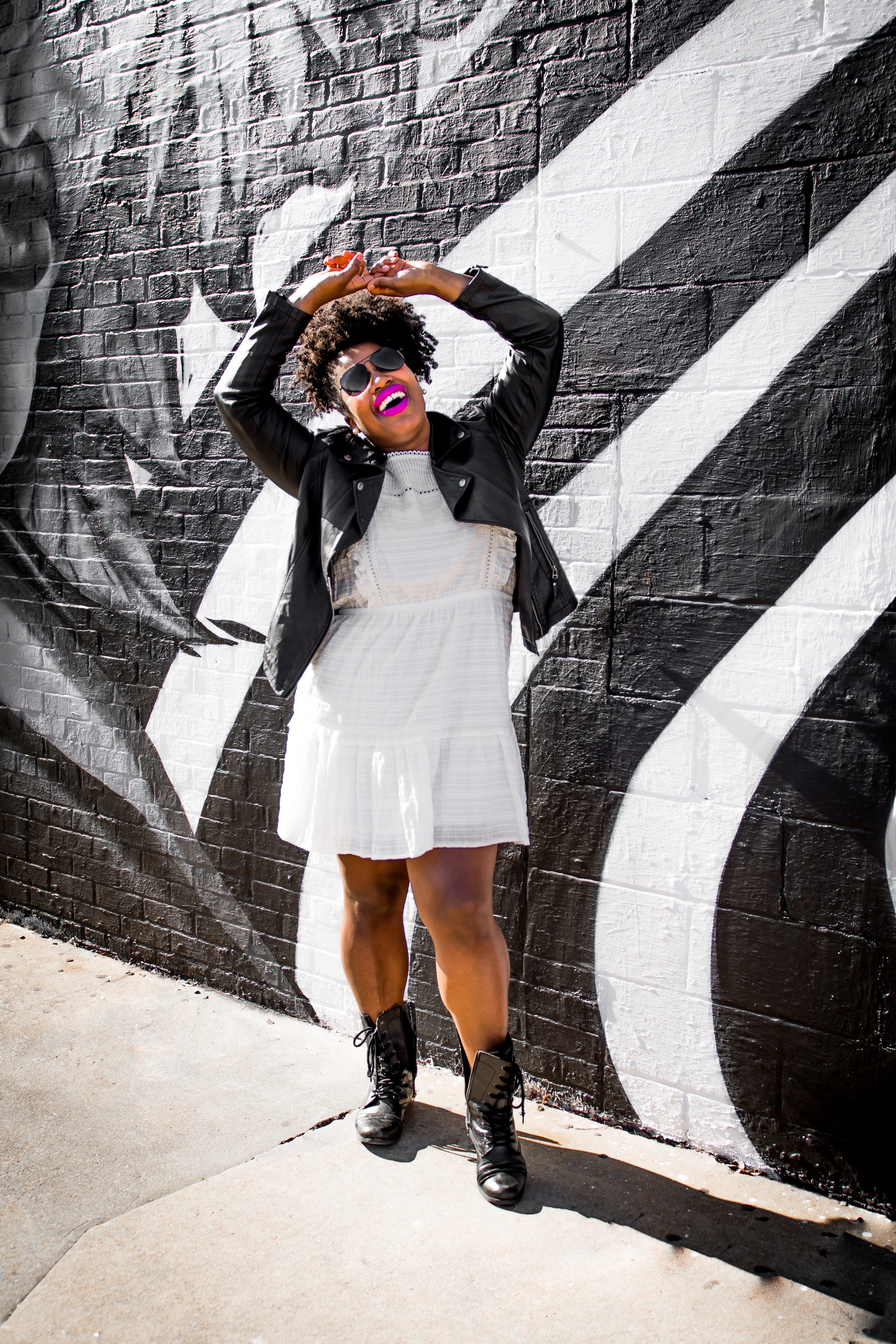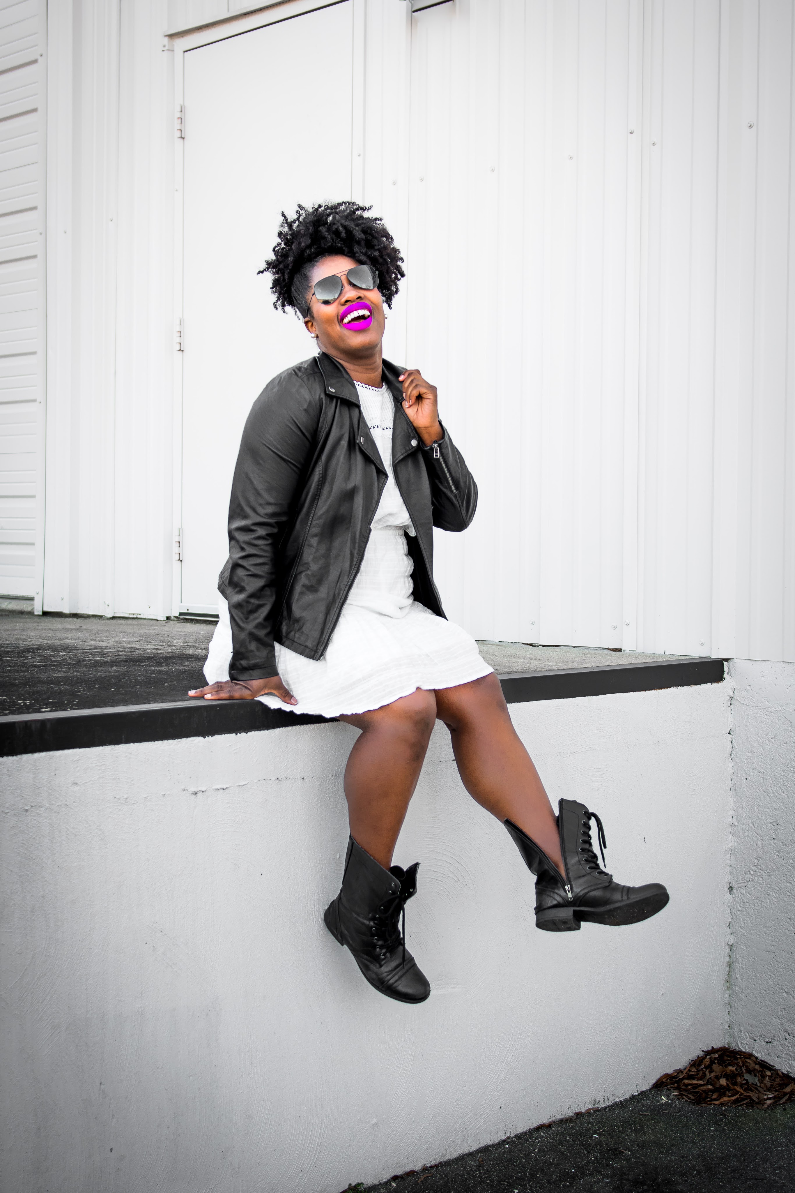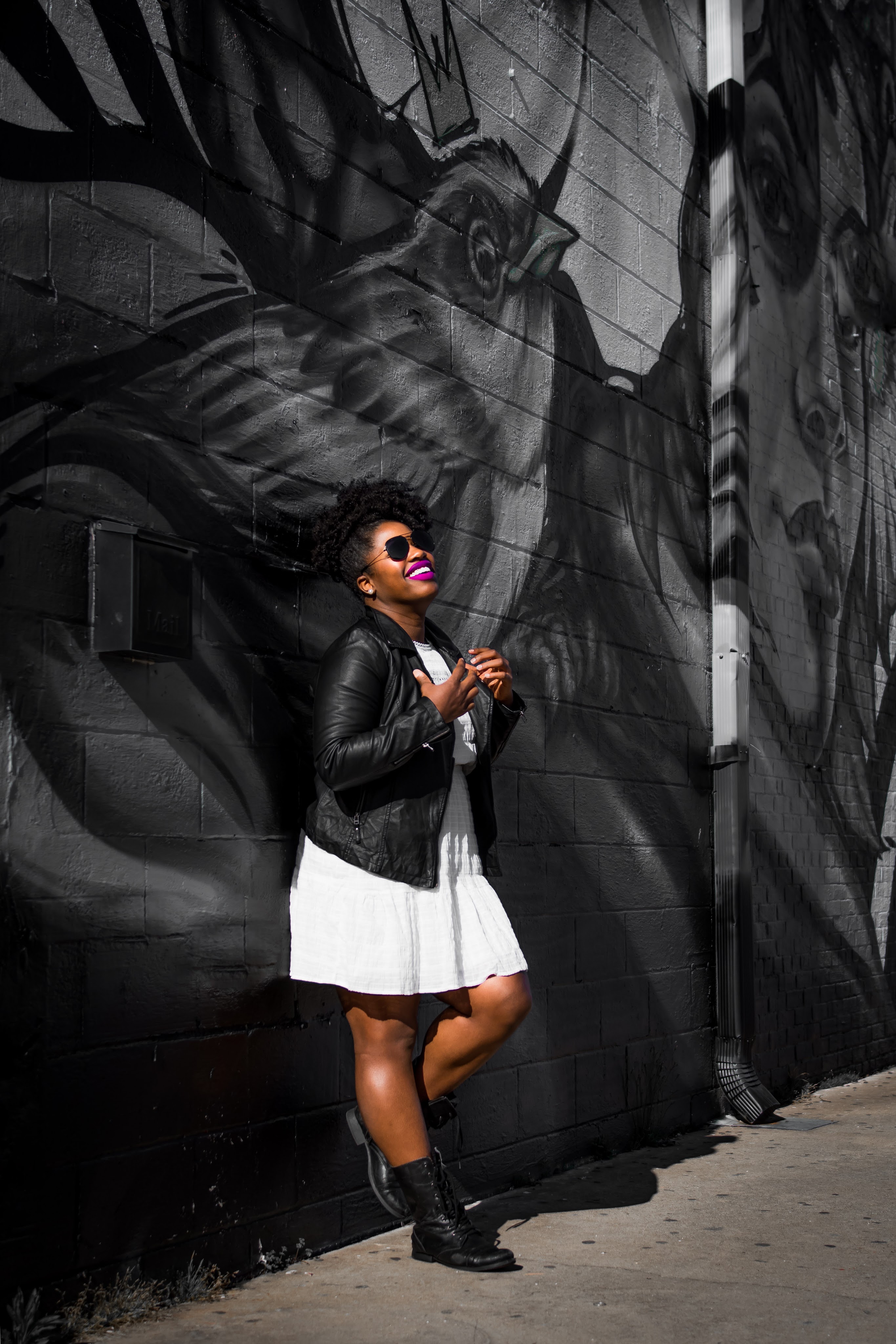 This is definitely my favorite way to style a leather jacket. Mixing the dainty vibes of a white prairie dress with the hard core vibes of a black leather jacket then adding a punk feel with vintage black leather boots is a whole mood. Also, this is a great way to easily transition into your spring wardrobe. It also helps to add a pop of color to your lips to really drive the point home that you’re so ready for spring!