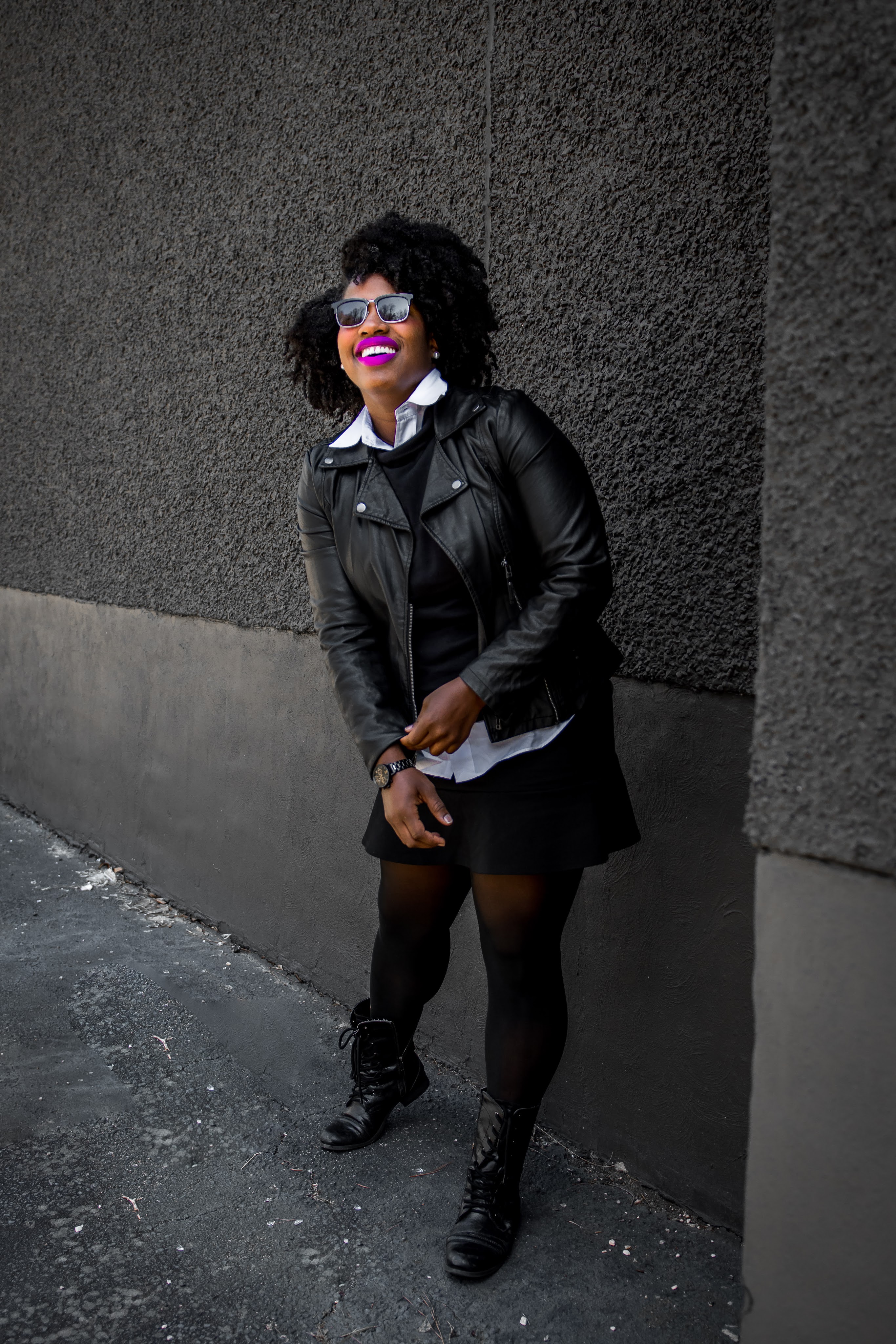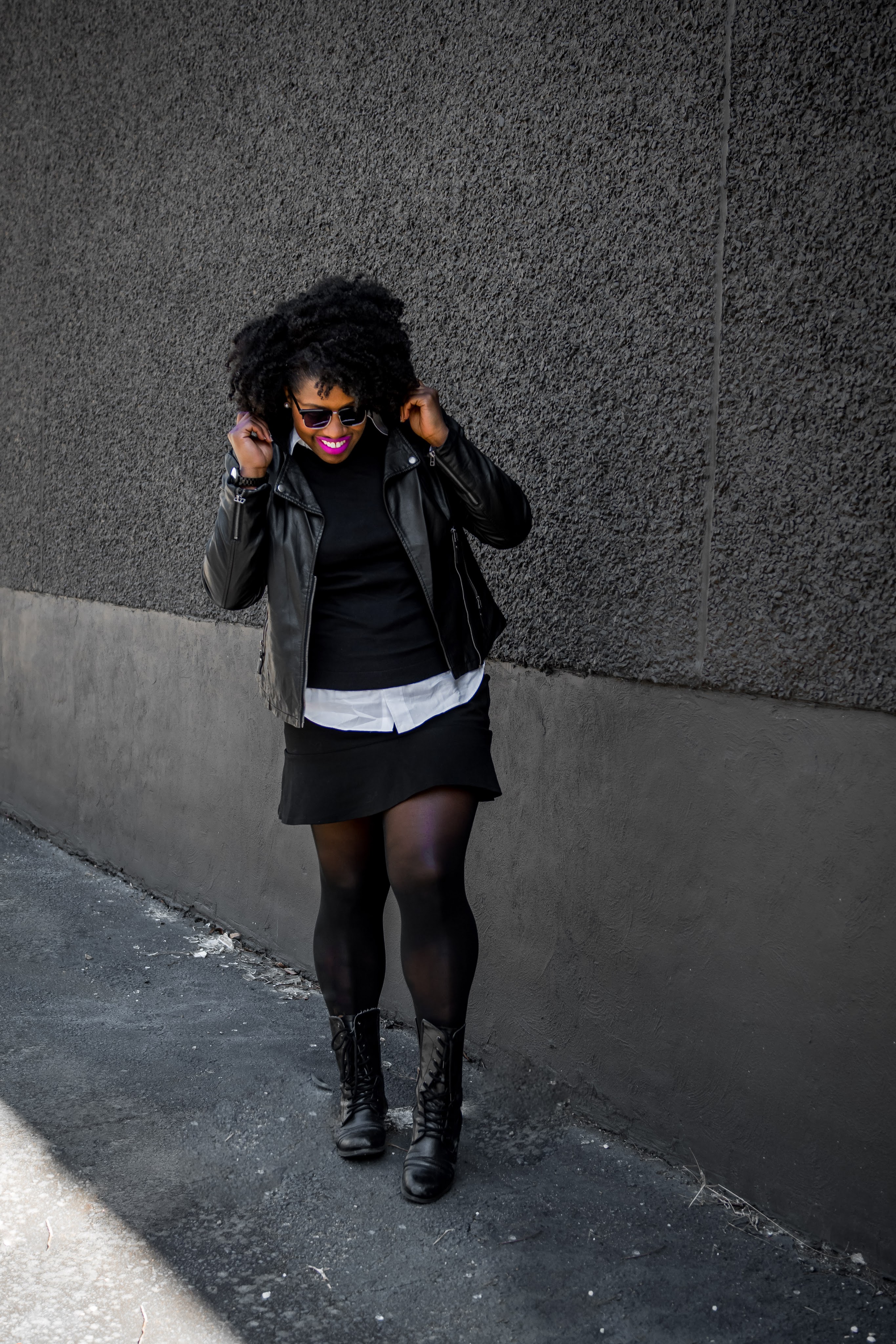 Black mini skirts are so versatile and work very well with a black leather jacket. Since it’s still a little chilly out here, it’s not really all that great of an idea to go out bare leg, so I’m a sucker for some black sheer tights too, add black leather combat boots and layer with a black sweater and white button up and voila! You have a nicely put together look you can rock out with your friends at brunch or wear after hours for a hot date night and depending on your office environment, you may be able to get away with this at work.