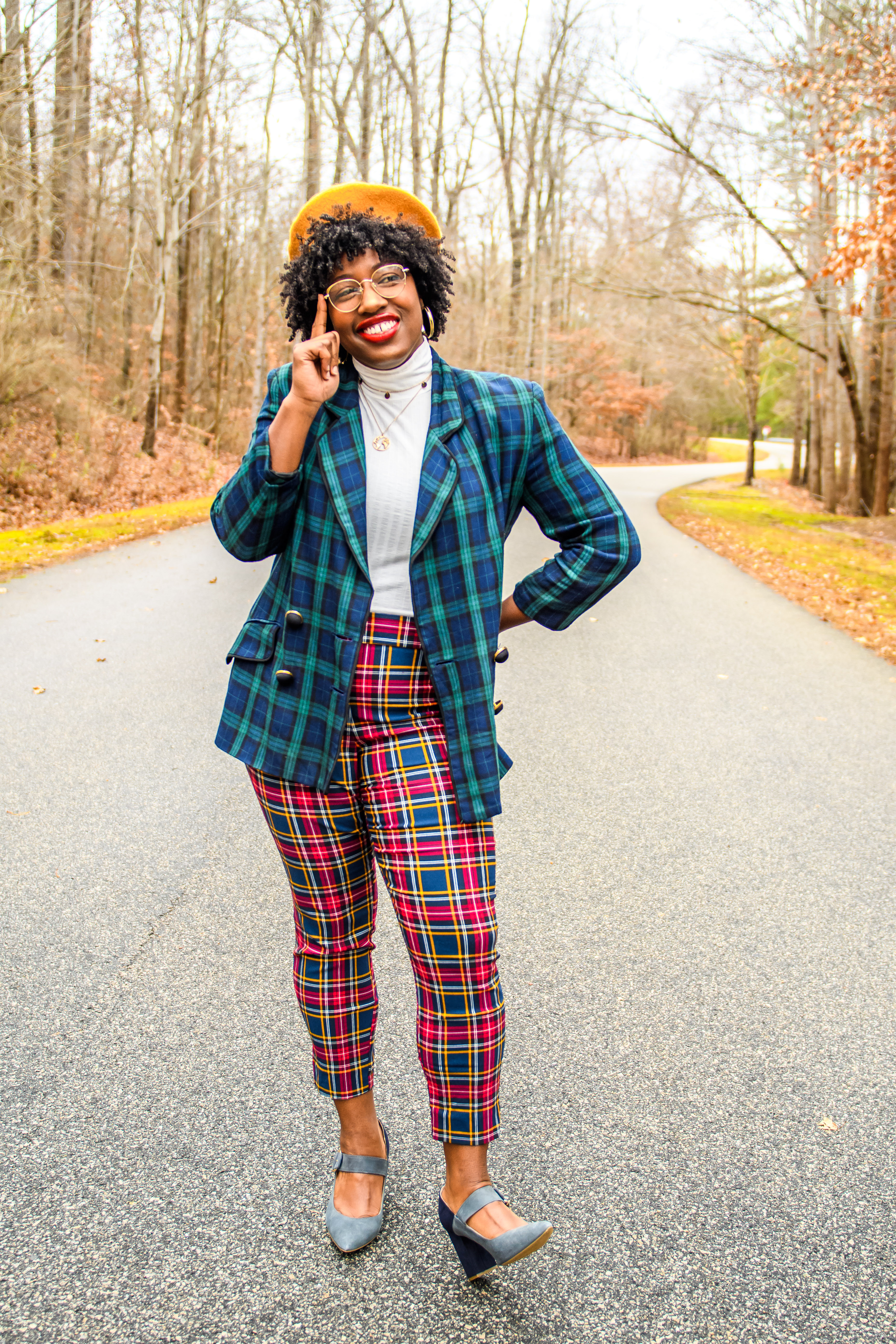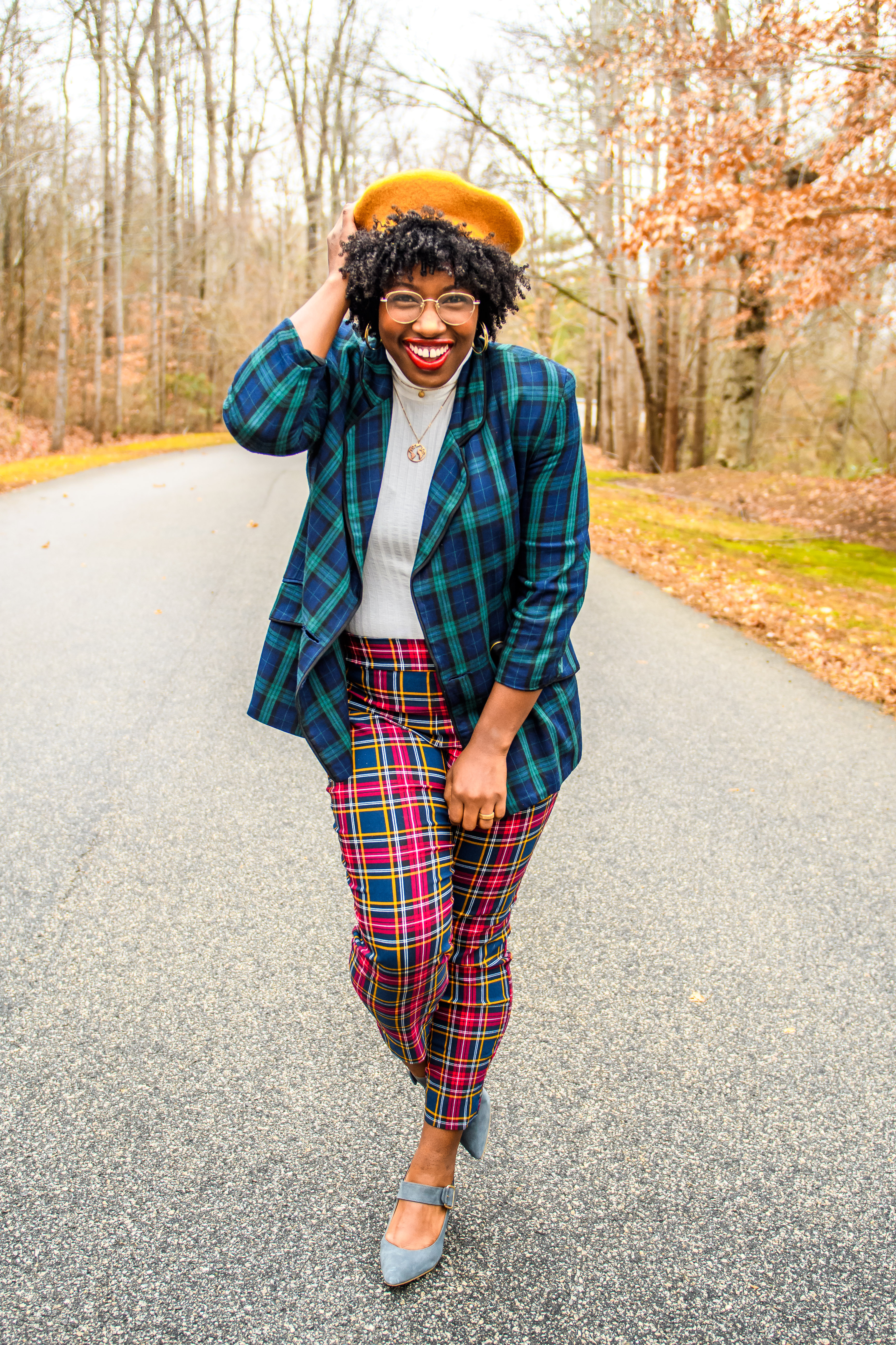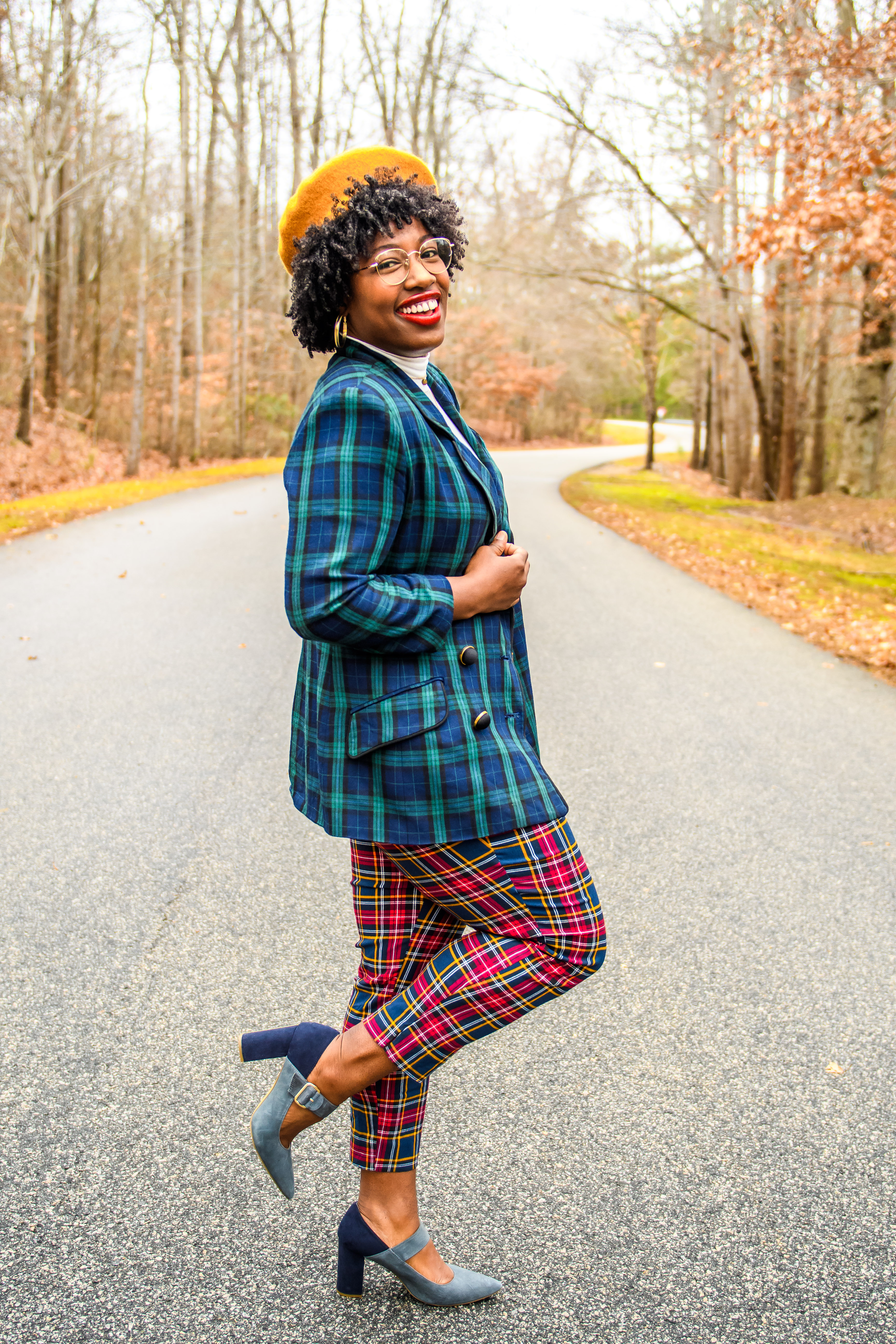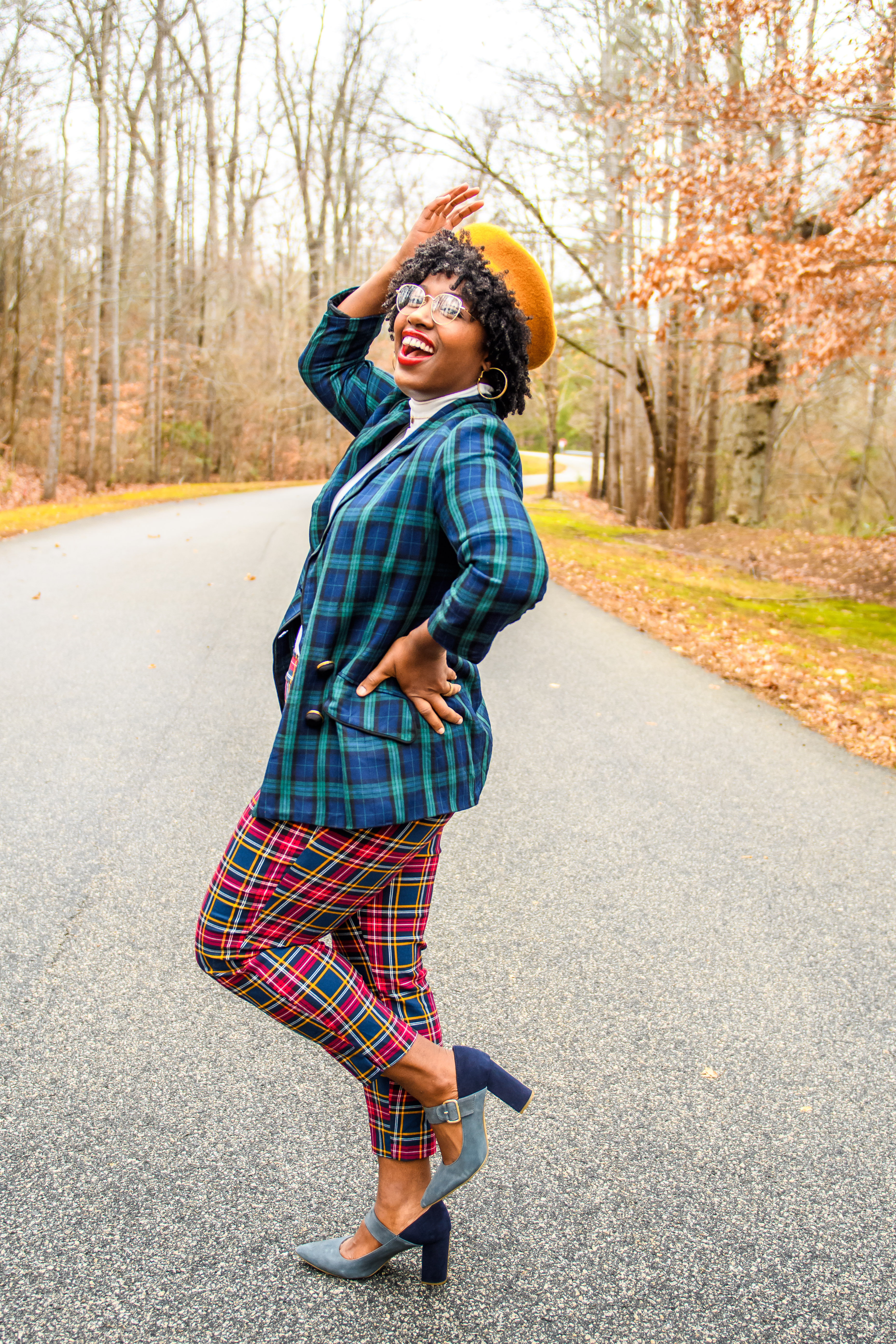Sometimes, all you need is to mix plaids that have at least one of the same color in it. I have the color navy in my blazer and plaid pants and that same color is reflected in my shoes too. This ties it all together and the outfit flows a whole lot better that way. There are exceptions to this. You don’t have to match all the time, but if you’re a plaid mixing newbie, finding the same color in all your separate pieces is a great beginners choice. I don’t typically play it safe, as I’m sure you already know, but for this I will.
