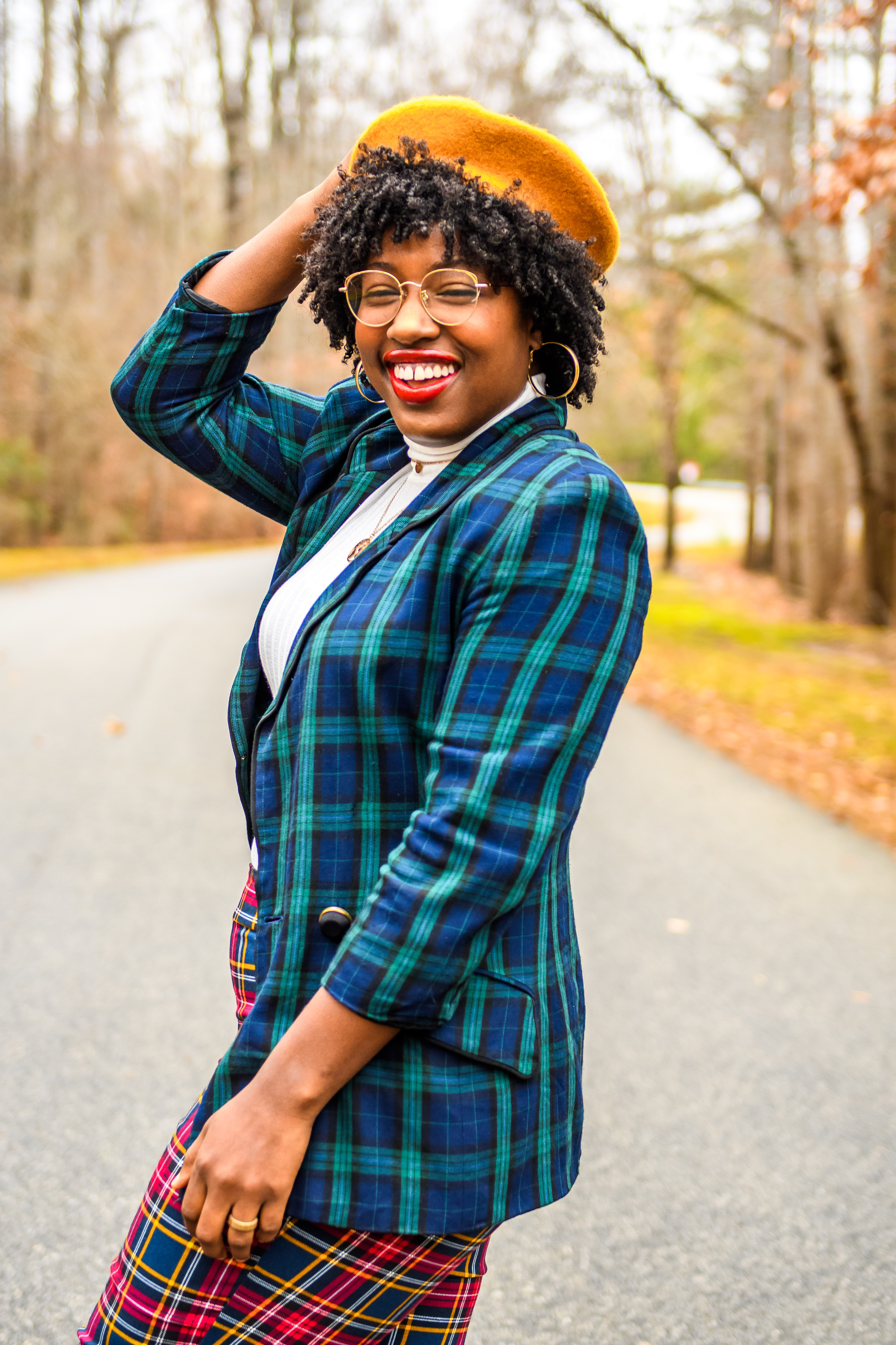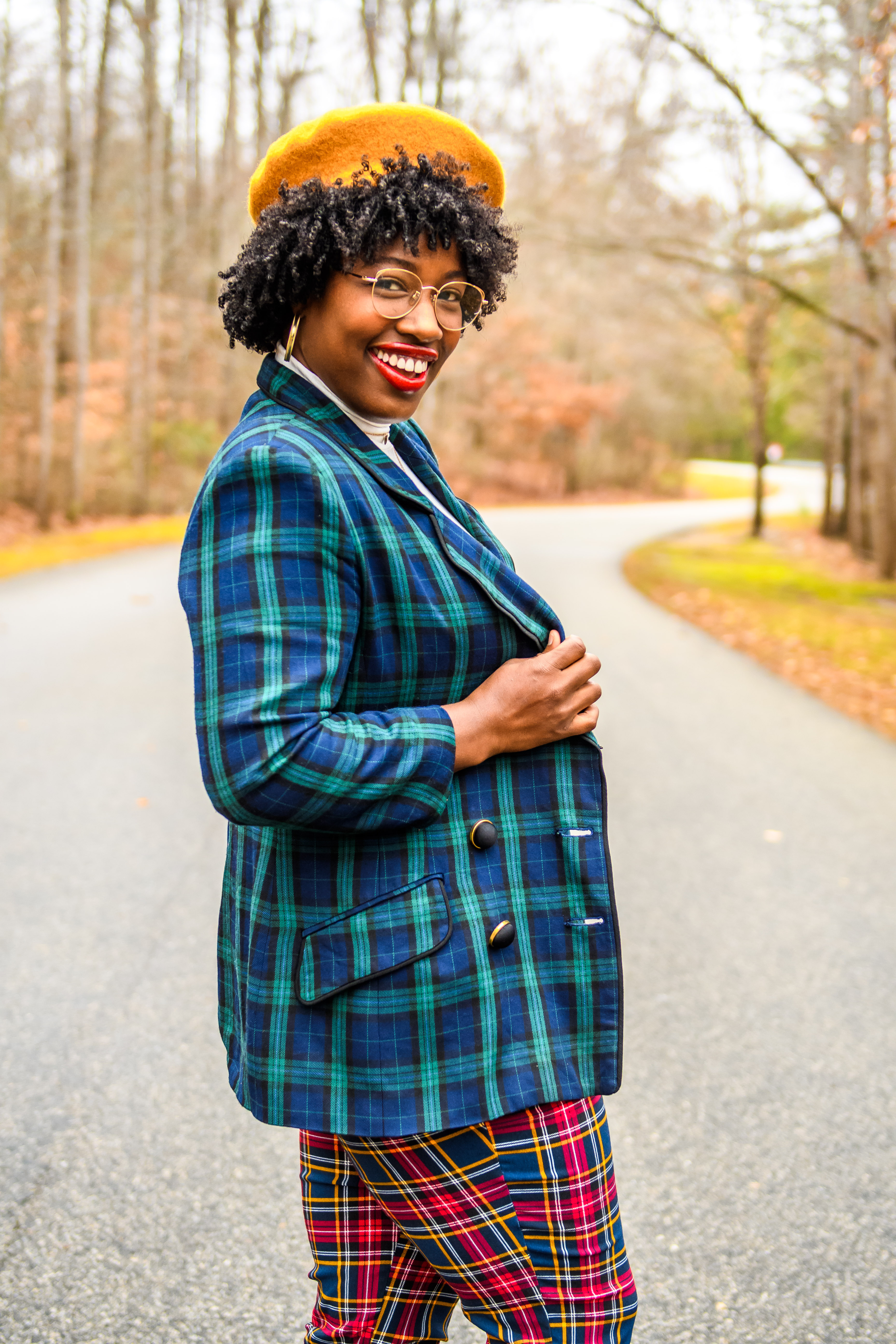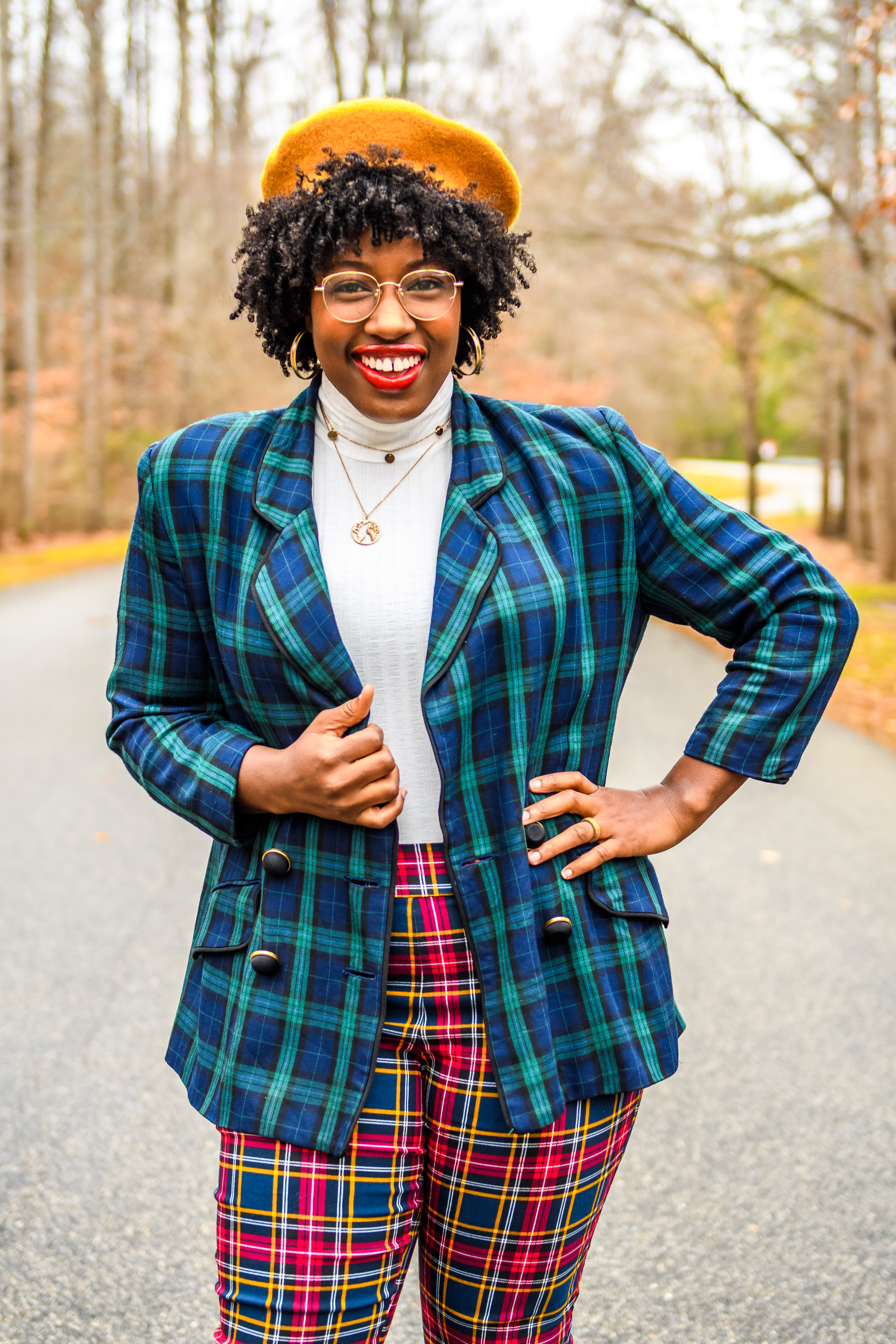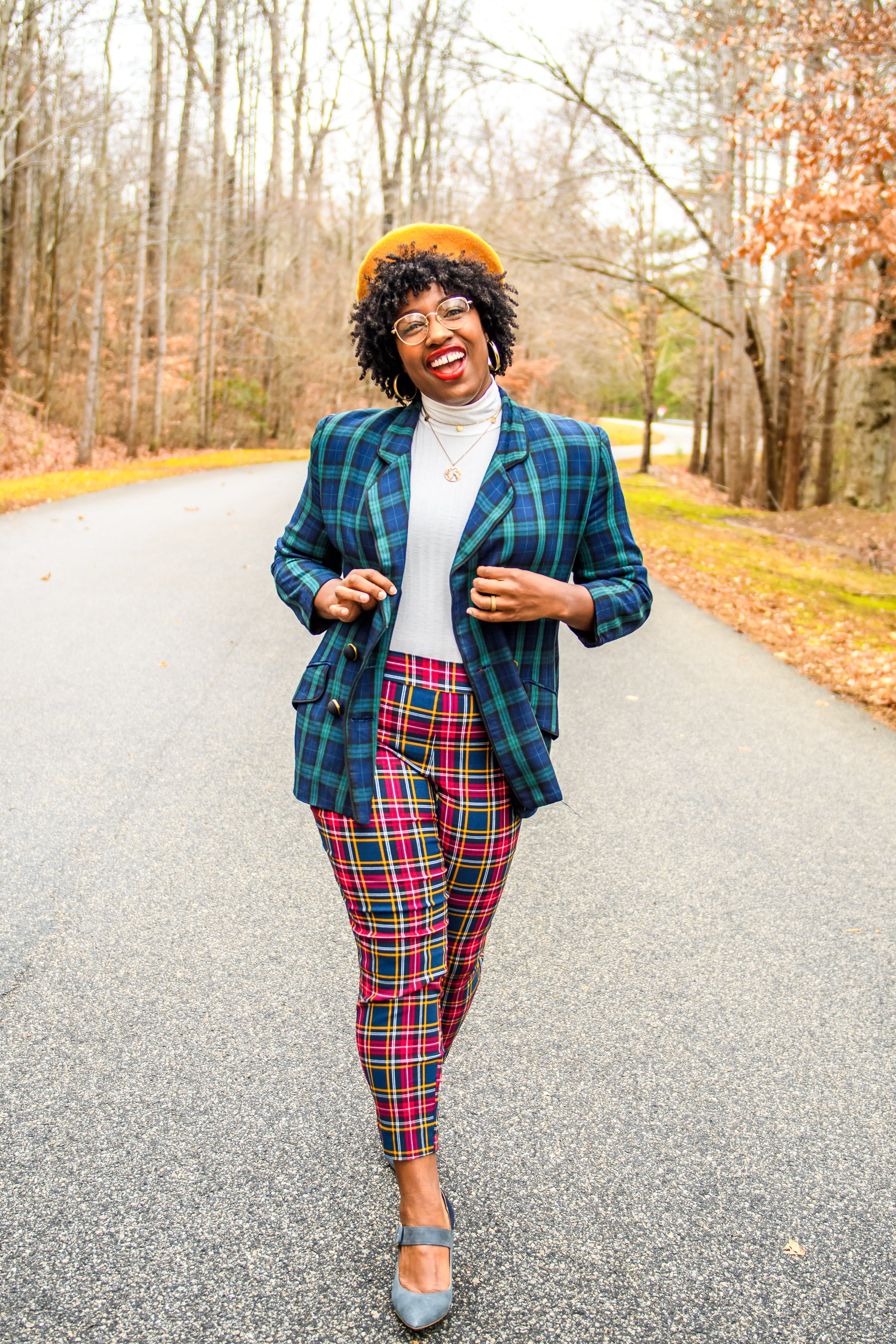 Sometimes, all you need is to mix plaids that have at least one of the same color in it. I have the color navy in my blazer and plaid pants and that same color is reflected in my shoes too. This ties it all together and the outfit flows a whole lot better that way. There are exceptions to this. You don’t have to match all the time, but if you’re a plaid mixing newbie, finding the same color in all your separate pieces is a great beginners choice. I don’t typically play it safe, as I’m sure you already know, but for this I will.