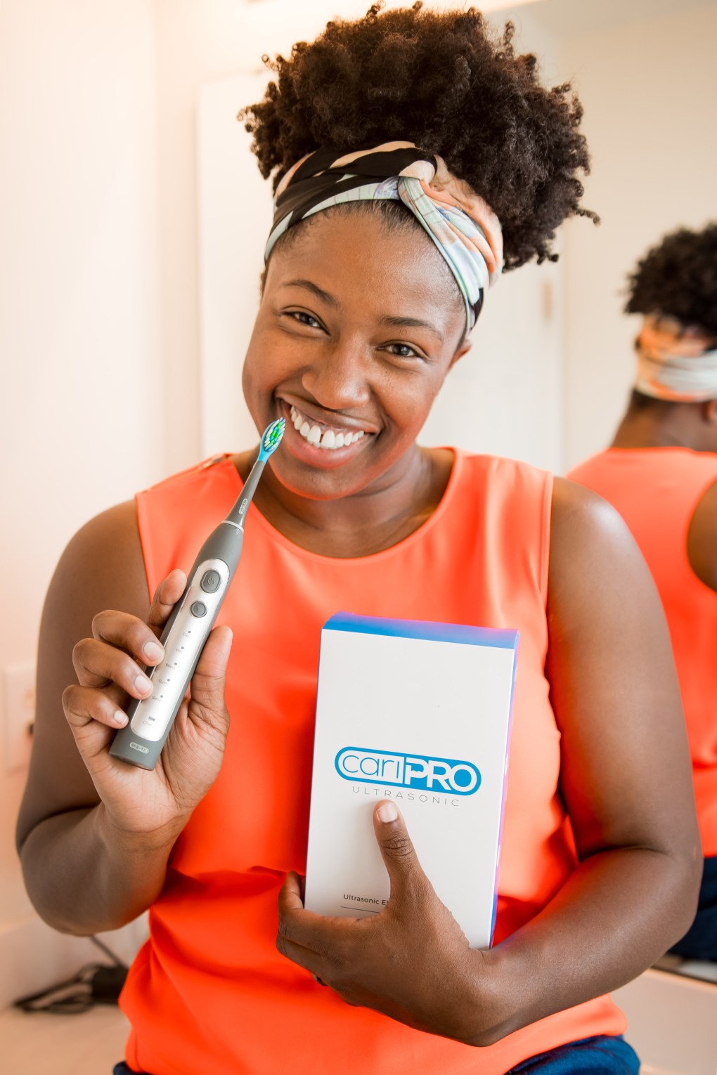 My new favorite hobby, brushing my teeth and more specifically, brushing my teeth with my new CariPro Ultrasonic Electric Toothbrush by Smile Brilliant. I started using electronic toothbrushes last year when my dentist recommended it during one of my routine visits. Apparently, manual brushing just wasn’t doing it for me. He said I was brushing too hard and it was taking a big toll on my enamel. He thought I might want to consider investing in an electronic toothbrush with soft bristles so, I asked for one for one for Christmas and bam, there it was, under the tree, wrapped up with my name on it. I’ve been using electronic toothbrushes ever since.